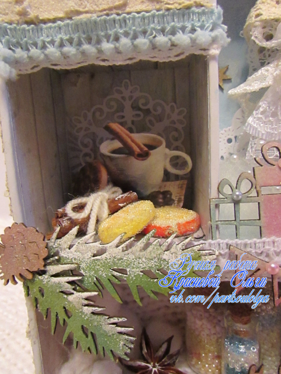 В работе использовала: переплётный картон для стен, скрапбумагу, в качестве освещения - налаженная система светодиодов и проводов. Питание от батареек. Различное кружево, стеклянные бутылочки, специи, деревянные и металлические украшения, жемчуг, бисер, фигурки из чипборда,текстурная паста.
