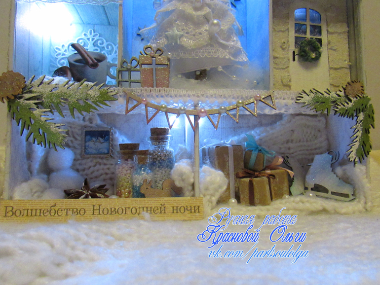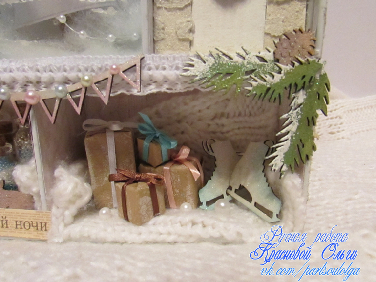 Домик разделен на локации. Внизу: подарки в уютной упаковке, коньки. Даже взрослый ждет подарки под Новый год!