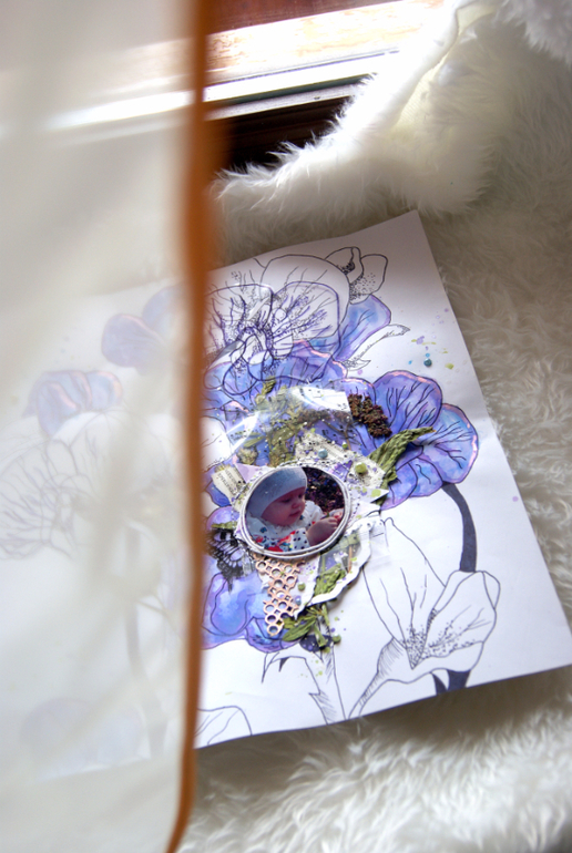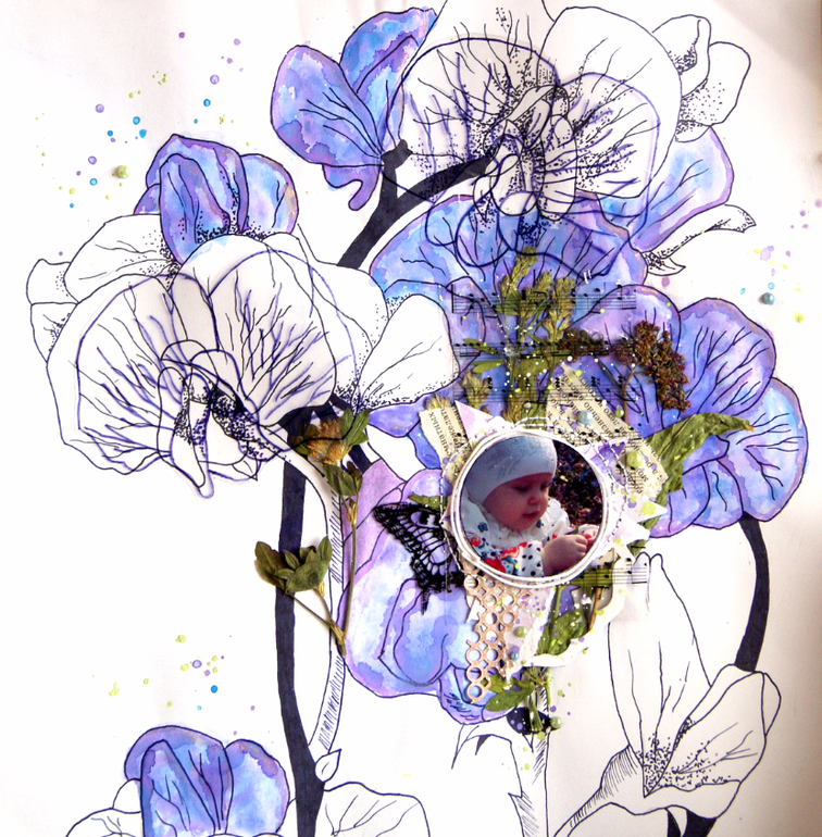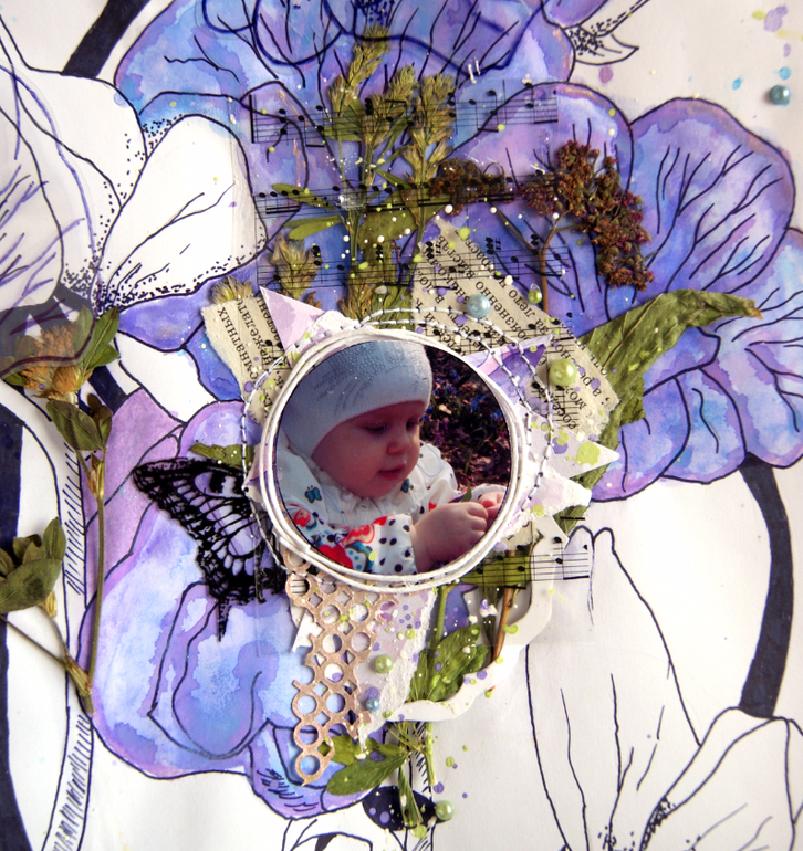 Когда делала её, почти не продумывала детали, но все они оказались довольно символичными. Цветочный фон (рисовала сама с помощью линера, акварели и спреев). Бережно засушенный гербарий, который я уже собиралась выбросить. На фото моё чадо, собирающее подснежники)) Даже книжная страничка, как оказалось, в тему - на ней статья о комнатных растениях и детях)) Одним словом, очень люблю эту страничку.