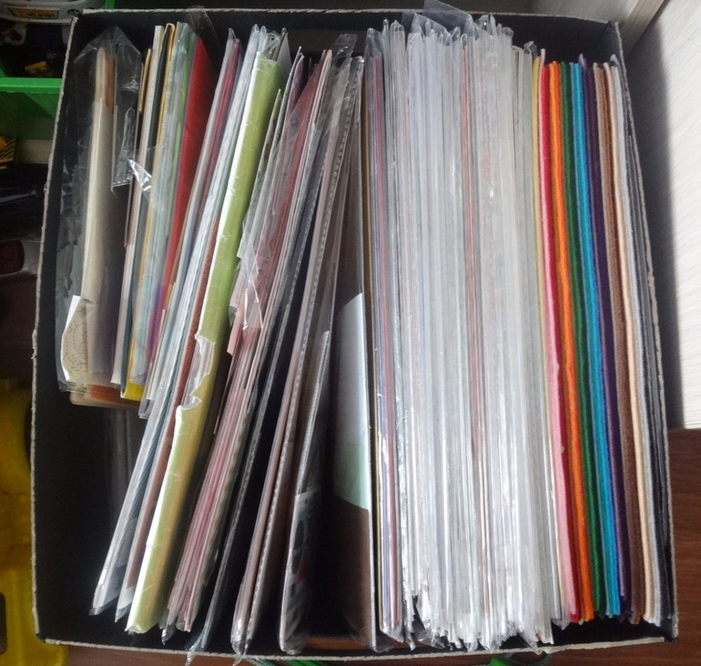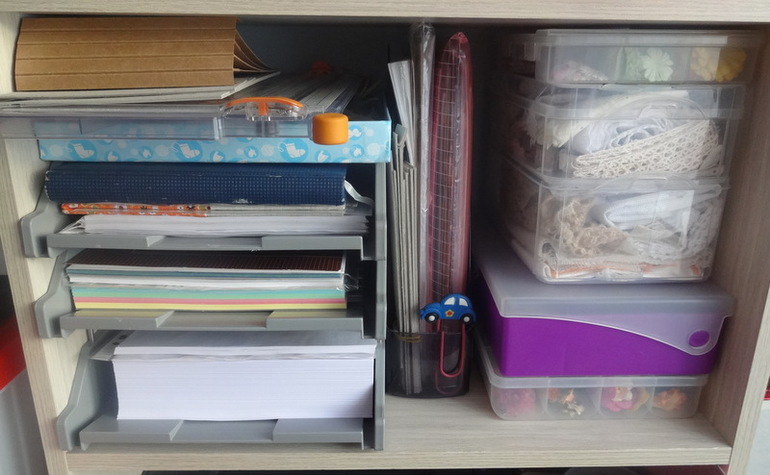 Перемещаемся на противоположную стену, а там стеллаж детей, нооооо ....на нем есть и мои хохоряшки - коробки от Икеи, где храню бумагу в наборах и остатки от бумаги по цветам и коллекциям , флис (внизу черненькие!)