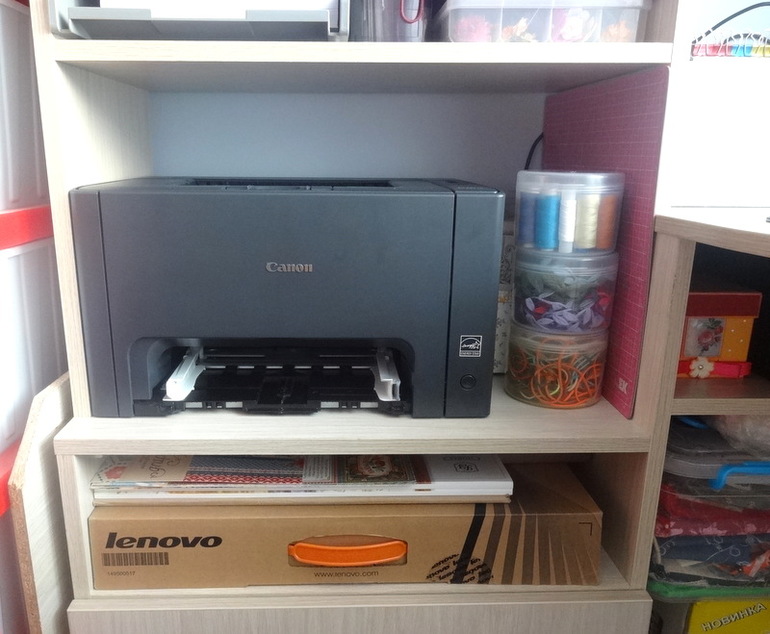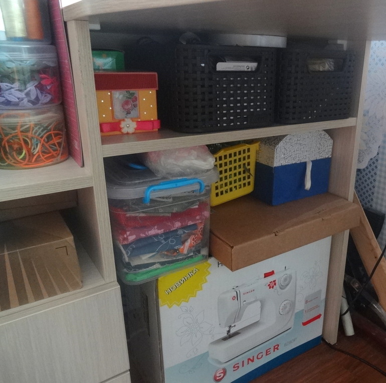 Сама машинка стоит на детском комодике с игрушками.. Рядом соседствует лоток с текущей работой