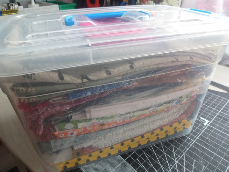 В коробке из-под машинки швейной - ткани, флис, слимтекс, джинс, канва. В сине-серебристом сундучке - остатки тканюшек, в пластиковом контейнере - ткани, которые мне нравятся...новинки