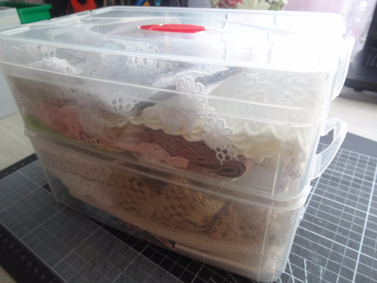 Этого ящичка мне очень маловато - тут прям все утрамбовано! Шитье, хлопковые ленты, гипюр, вязаные салфетки и проч.