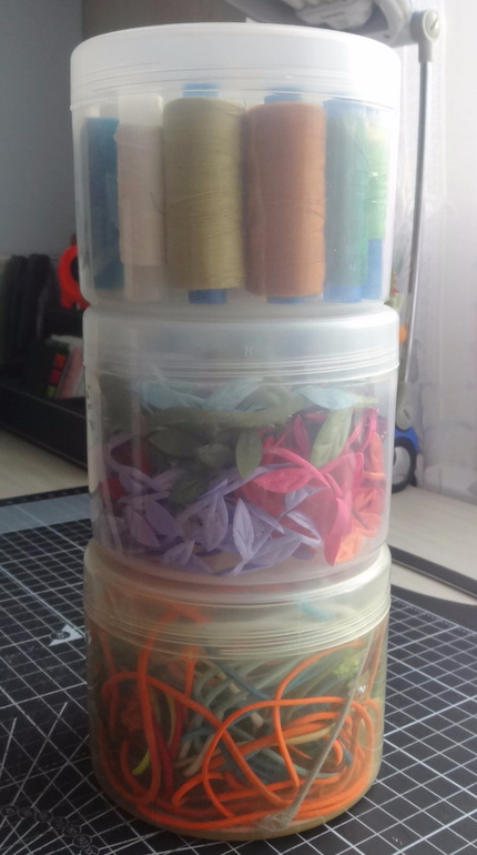 Рядышком баночки из-под мыла, в которых уютно себе так уместились нитки, ленточки -ветки и шляпные резинки
