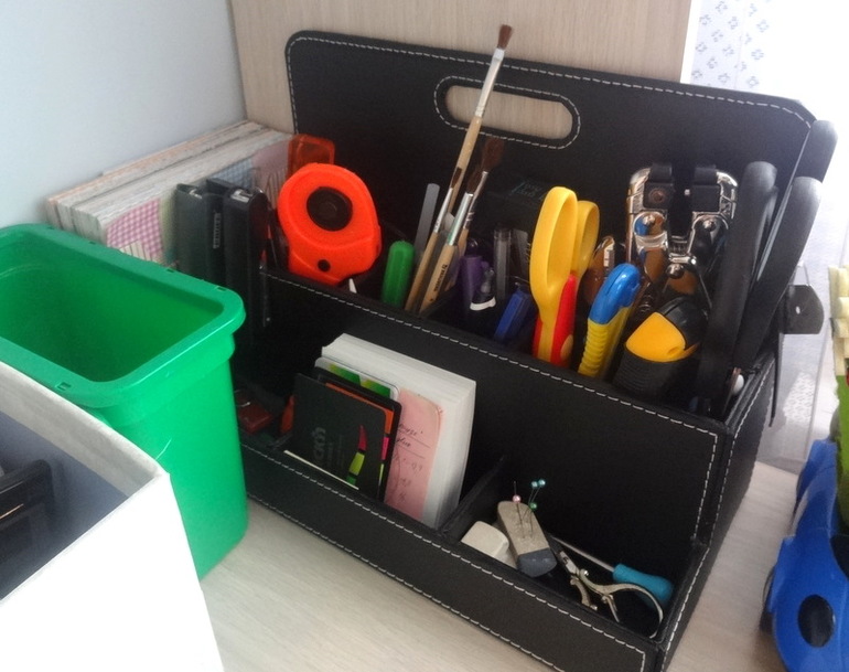 Проследуем чуть правее к окошку. Это - инструментарий. Тут у меня все мои любимки - скруглитель, кропадайл, клеевой пистолет (он у меня малюсенький - из фикспрайс(все по 47!, поэтому его не видно), кисточки, ножнички, ножики, палки, карандашики. Отличный органайзер тоже из Икеи. Ближе к стене - наборы бумаги по коллекциям 15*15