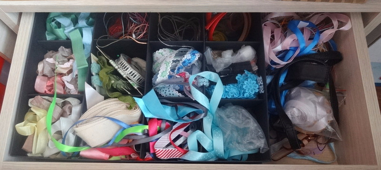 Перемещаемся ниже - и один из выдвижных ящиков - мой позор! Да-да!!!! Вот так я храню ленты!!! Мне честно бывает стыдно - навожу порядок, но... он долго не держится... При этом я точно знаю - где какой кусок от какой веревочки!
