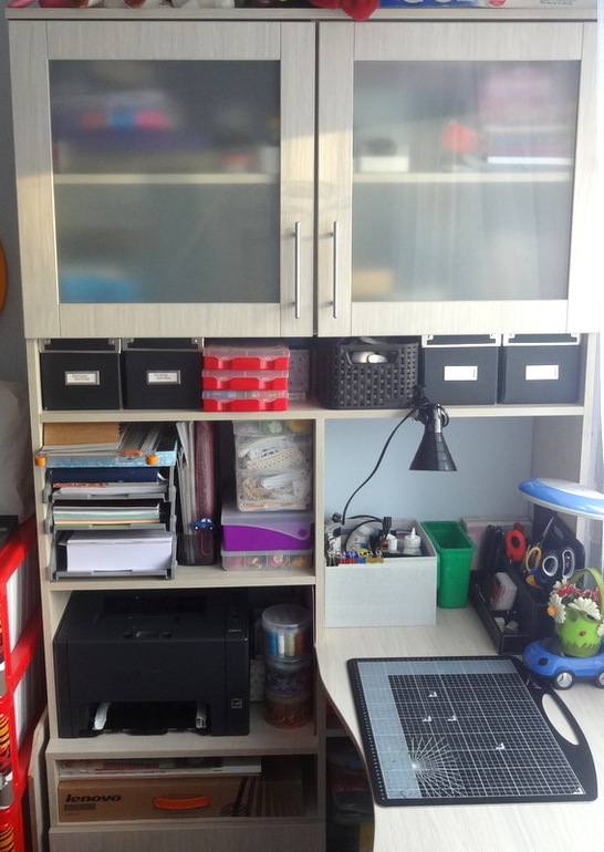 Изначально и это остается неизменным - это детская комната моего старшего сына. Стол заказывался исключительно под его интересы... Но случилось так, что мамаша с головой окунулась в сказочный мир скрапбукинга, и Остапа понесло, и пришлось сыночку очень потесниться, чтобы мамины богатства нашли свое место ненадолго (до переезда в более просторные хоромы!). Теперь я занимаю почти весь стол, за исключением верхних закрытых шкафов.