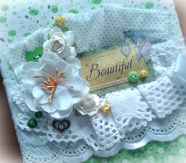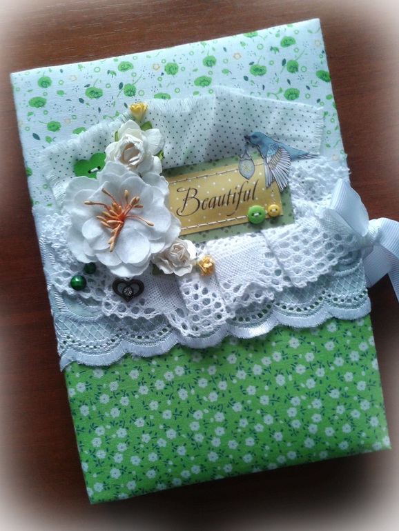 Блокнотик А5, мягкая тканевая обложка, более 200 стр., коптский переплет. На обложке использовала шитье, кружево, хлопок, цветы, вырезки из бумаги, граненые камушки, пуговички и подвесочку