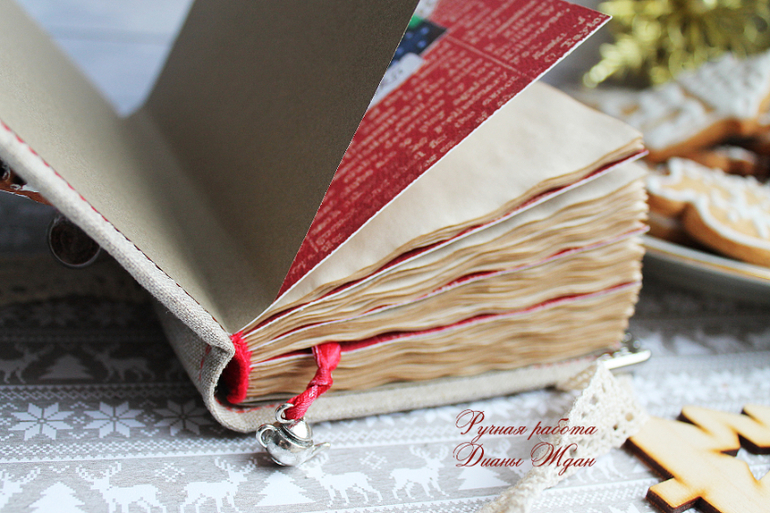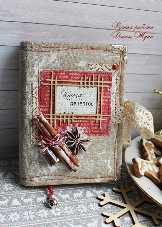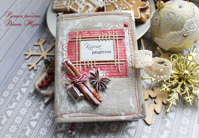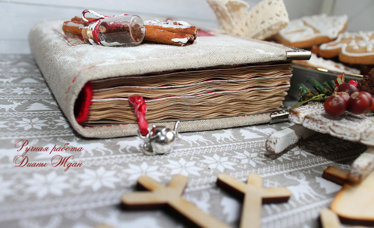 Работ новогодних тоже немного совсем, пятерка кулинарных книг и пара календарей. На фотографирование времени не хватает катастрофически, т.к. мой фон с хорошим освещением на балконе сейчас завален коробками и летними покрышками и к нему не подойти. Поэтому дома я изощряюсь с фоном, как могу, стараюсь успеть ко времени, когда уже не темно и еще не темно))) Все книги я фотографировать не стала, некоторые уже подарены, но они очень похожи, обложки из одной ткани, разница только в цвете разделителей. Формат А6, по 120 состаренных в кофе листов с волшебным ароматом, обложка - мой любимый лён. Содержит 4 раздела: напитки, салаты,горячие блюда, и самый большой раздел - выпечка и десерты.
