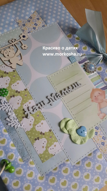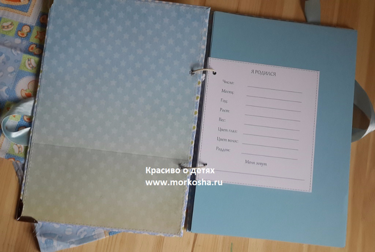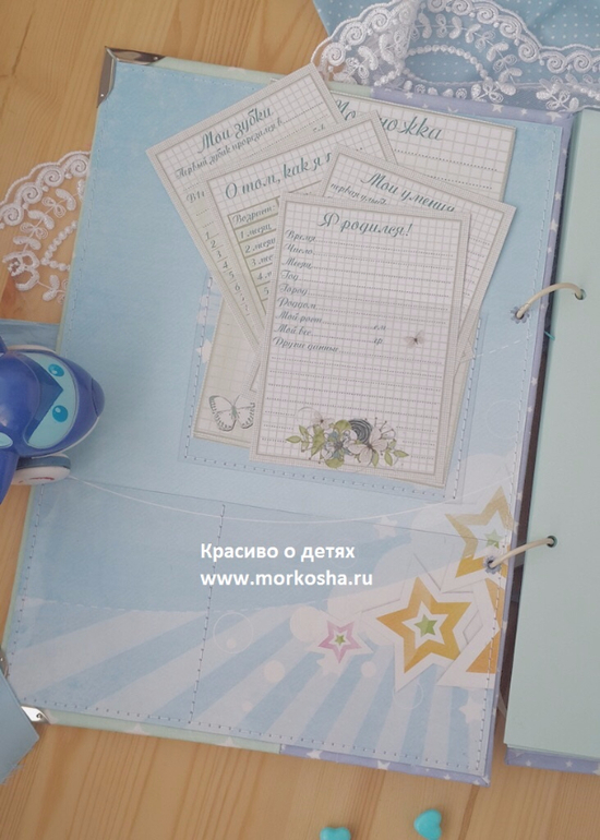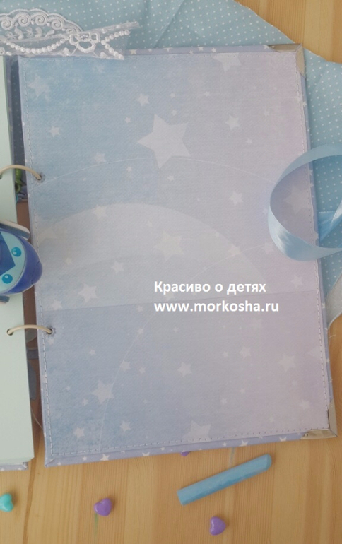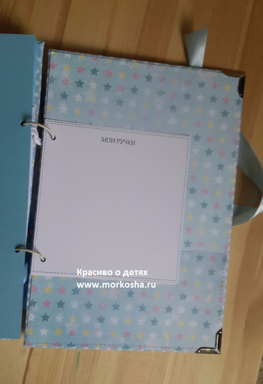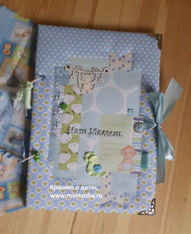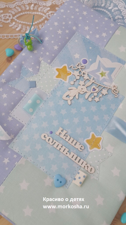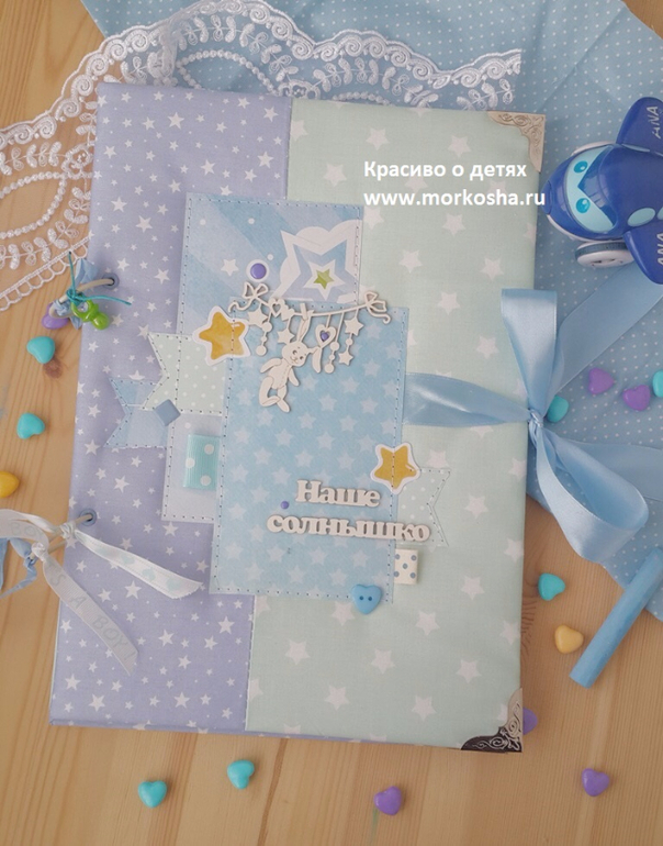 2) Фотоальбом "Наше солнышко" формат А4, внутри 30 листов нежно-голубой плотной бумаги, на которых уместится до 240 фотографий 10х15см, также 2 прозрачных кармашка на форзацах для доп.фотографий и 6 табличек-наблюдений от 0 мес до 1 года.