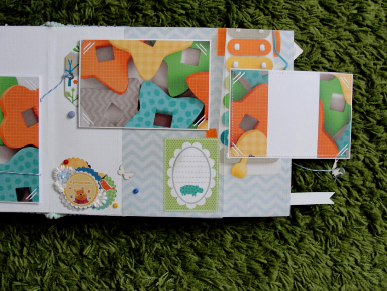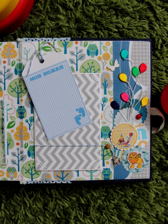 Фотоальбом размера 23*24 см, 6 разворотов в нем, подложки для а 62 фото 10*15, есть разные тэжикик для записей мамы о сыне( отпечатки ручек и ножек, динамика роста , график прорезывания зубов, первый прикорм, первые слова и т.д.). Папа просил альбом яркий и пацанячий, а маме хотелось нежности и цветочков)))Постаралась угодить всем - родители остались довольны!