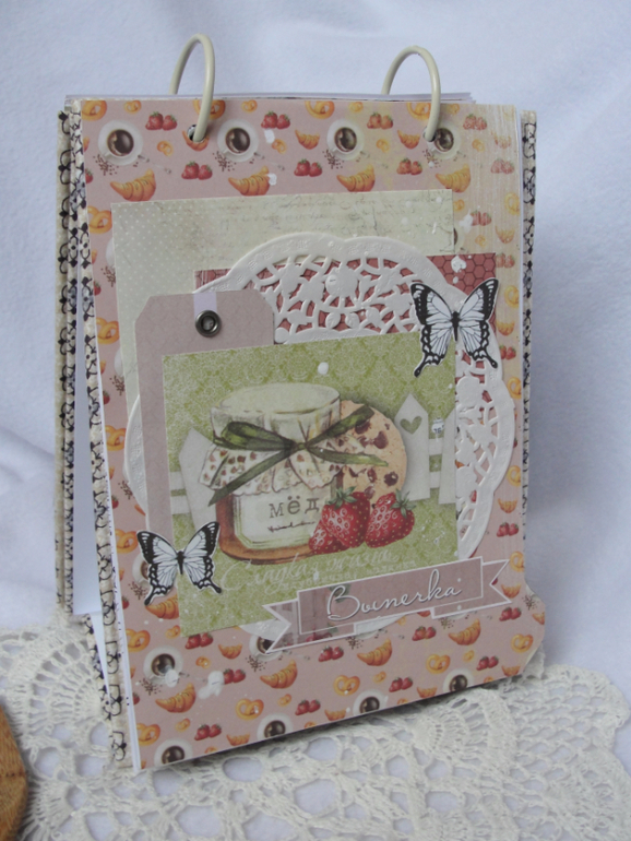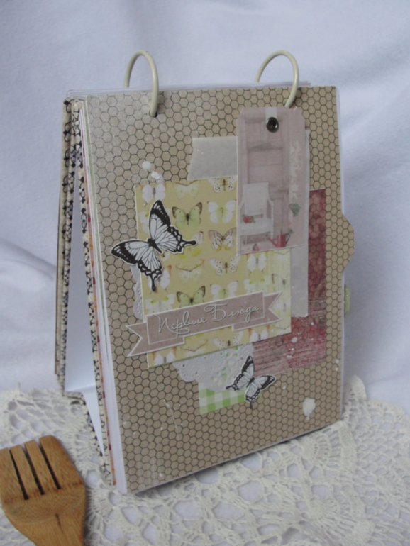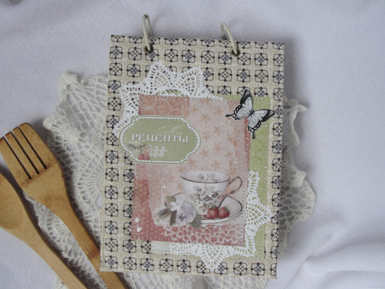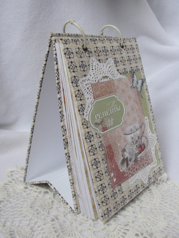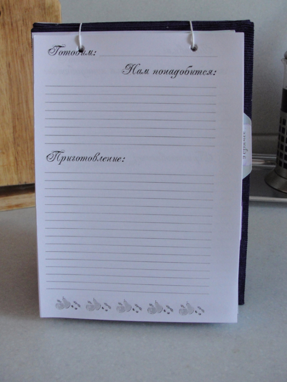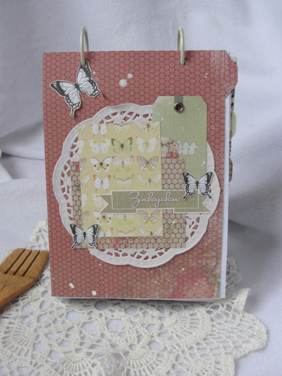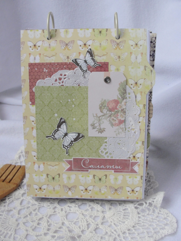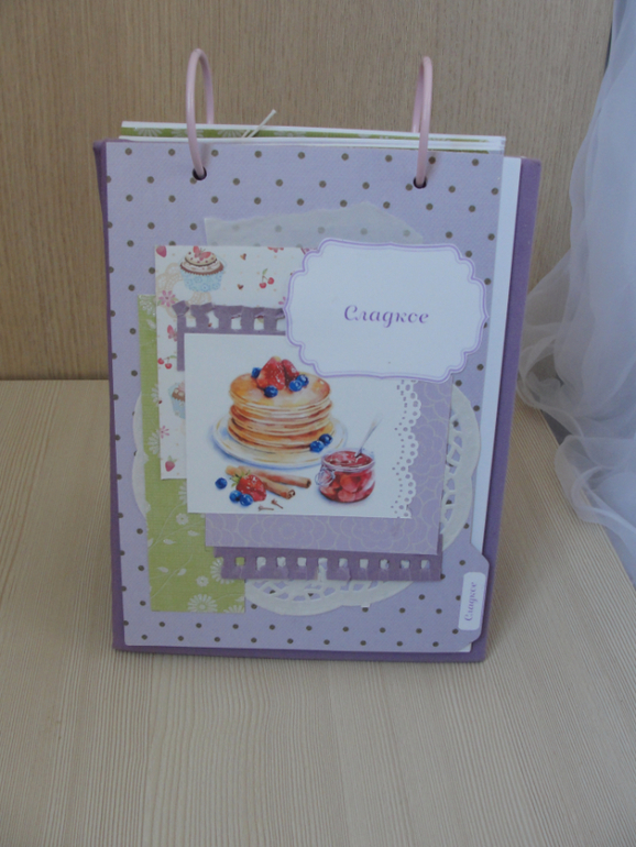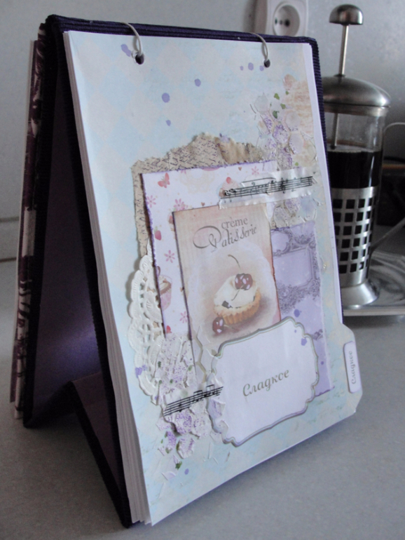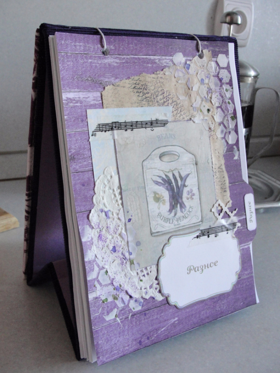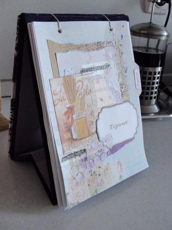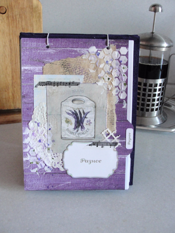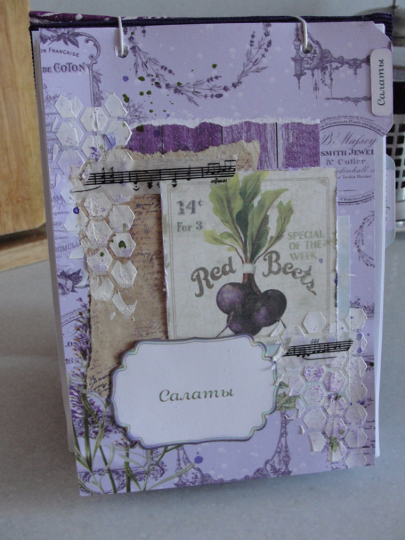 Обе книги одинаковые по сути: формат А5, 4 тематических разделителя из скрап бумаги( салаты, горячее, разное и выпечка), внутри 80 линованных листочков. Сборка у фиолетовой книги на вощеный шнур, у сиреневой на кольца. Смотрим?