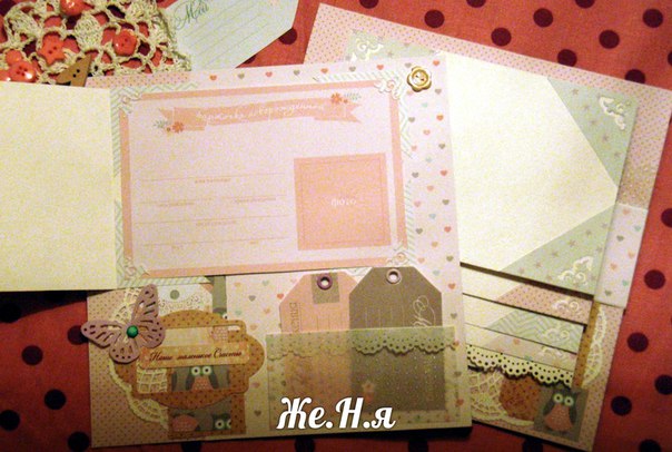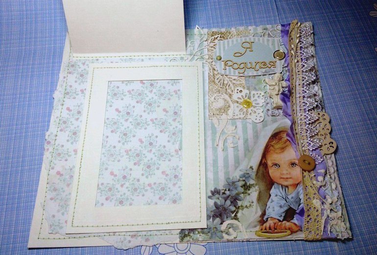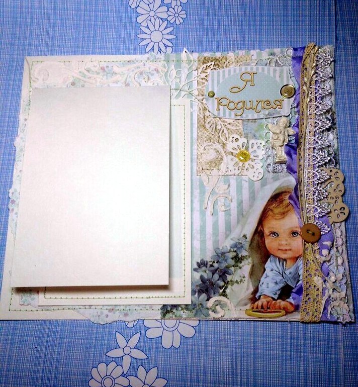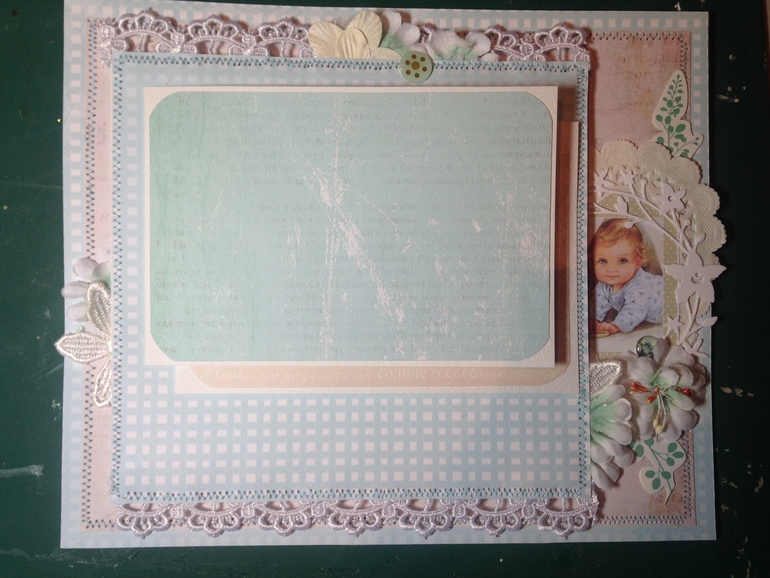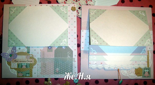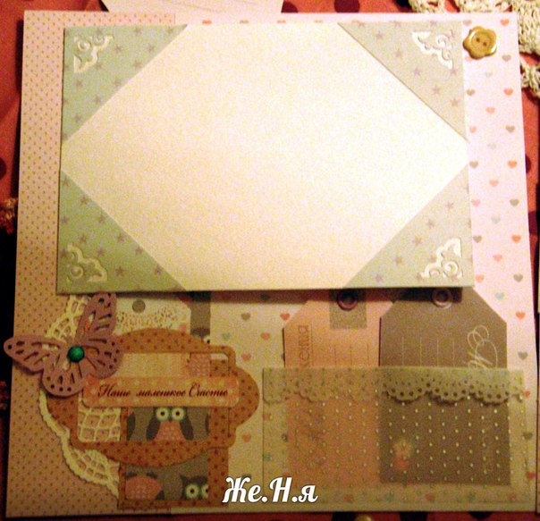 Обязательные элементы для первого разворота (на выбор как минимум три элемента!): рамка (это может быть рамка для фото, рамка для записей, лепнина), конверт или карман, птичка (тут тоже на выбор - вырубка, лепнина, чипборд), пуговицы, бабочка, высечка или вырубка
