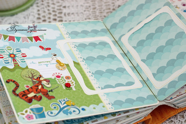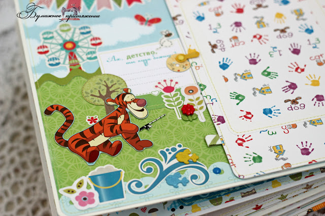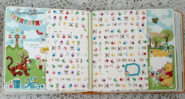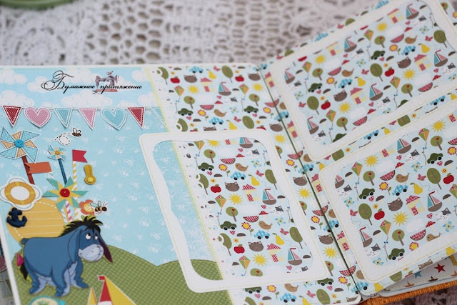 В альбоме 6 декорированных сложных разворотов и 5 простых, где главным украшением станут фотографии хозяина. На всех сложных есть местечки для небольших заметок. Бумага - микс из польской БумажнойГалереи и ЭкоПарка. Каким-то невероятным образом эти 2 набора сочетнулись просто идеально, при том что вживую я их раньше не видела. Интуиция) Кстати, и называются эти наборы почти одинаково - Летний день или что-то вроде того. А вот наборы с Винни от АртУзора, о которых , я так и не решилась использовать, так, повырезала капельку из нее. Все-таки кайф от работы с красивой качественной бумагой значительно выше, чем ее цена.