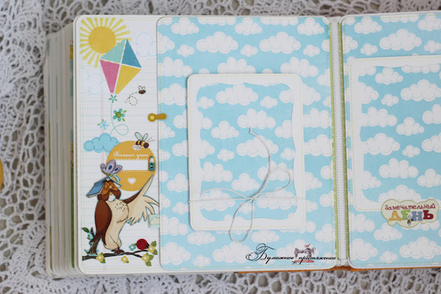 На этой страничке конструкция "водопад" - тянем за ярлычок вниз, и рамочки с фото начинают сами собой перелистываться. Всего 4 фото плюс выезжает карточка для записей: