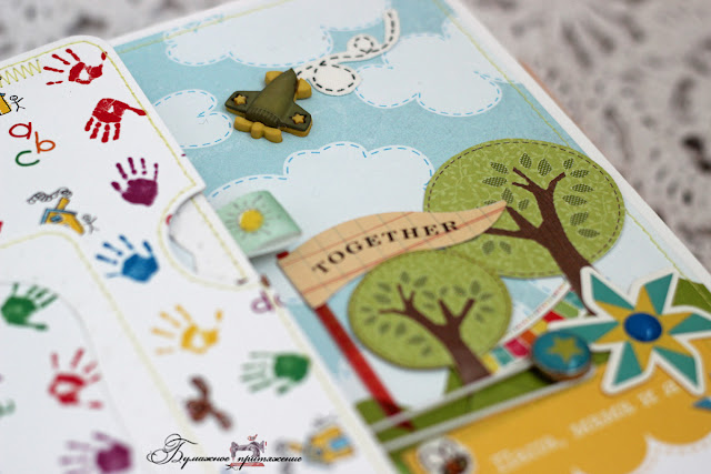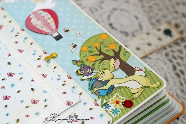 Достала из закромов незаслуженно забытые декоративные пуговки и активно внедрила их в сказку) А еще кучку веселых брадсов и море ярких наклеек. А еще облакааа...Мой любимый принт в этих наборах бумаги, растянула их на все 6 разворотов. Кстати, ко многим польским наборам бумаги идет бонусом полоска с картинками. К моему шли картинки с деревьями, вот спасибище огромное производителю за них, он стал спонсором Волшебного леса) На каждой страничке - полянки и лужайки, на которых герои мультика ищут приключения на свои пушистые попки) Мультяшки веселятся и грустят, играют в игрушки и едят сладкое... В общем дети как дети)