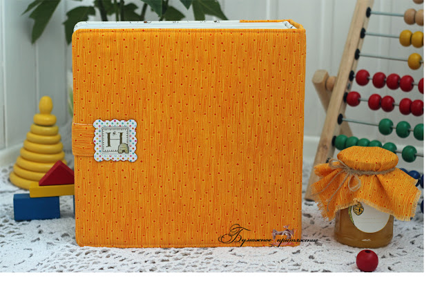 Желтой ткани для обложки не хватило из-за толщины альбома, скомбинировала с белой тканюшкой с пчёлками, она невероятно классная! А эти пчёлки у меня пролетят через весь альбом ;)