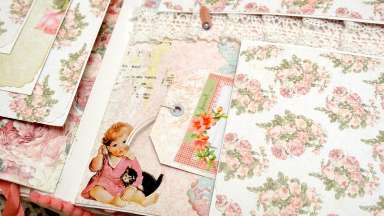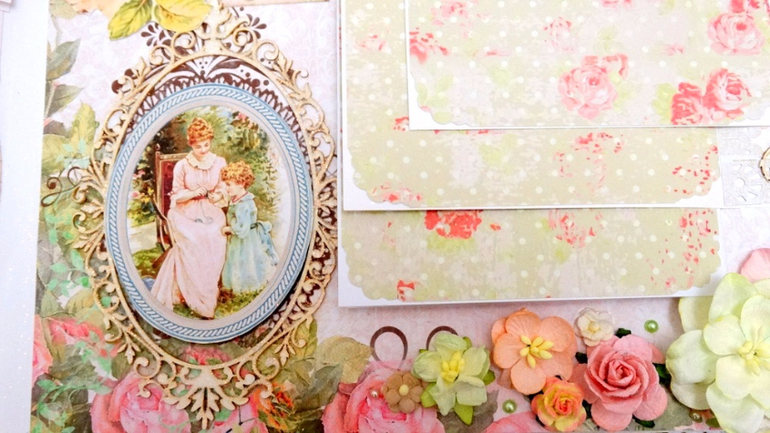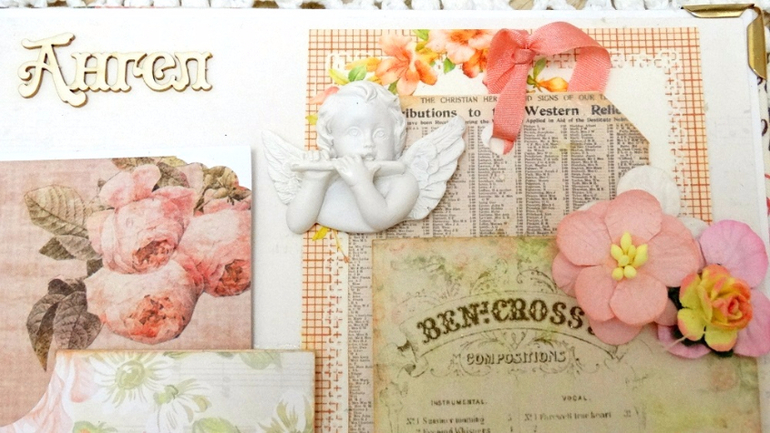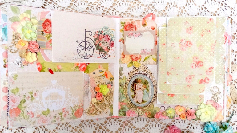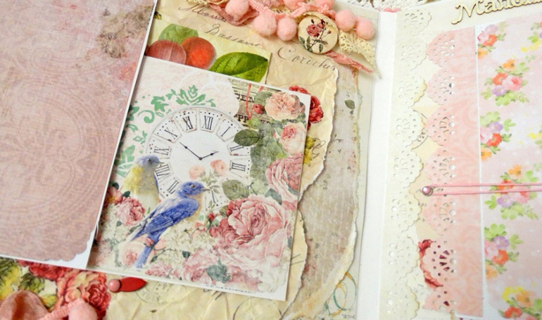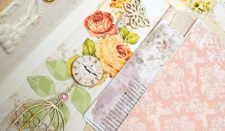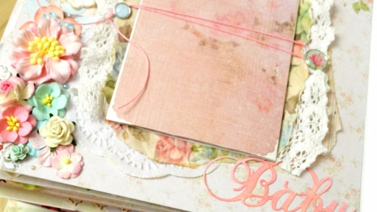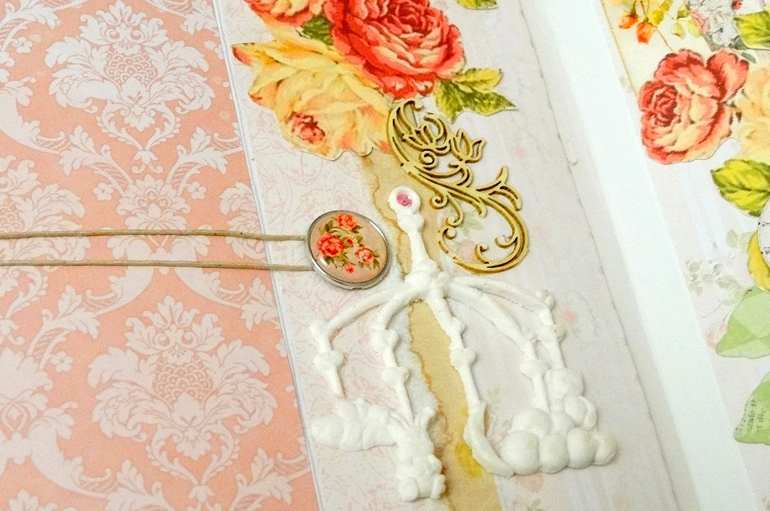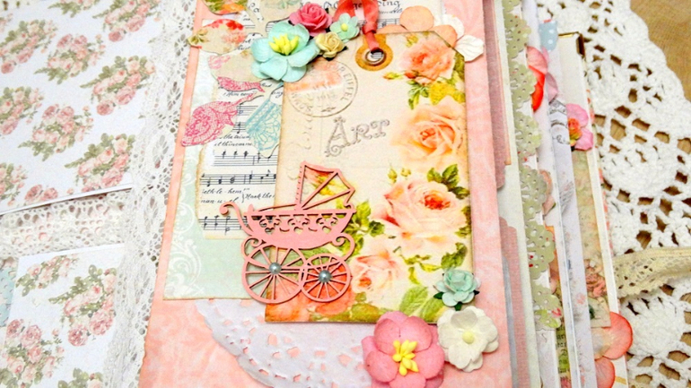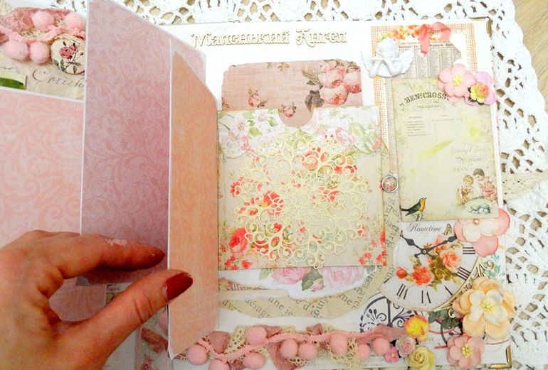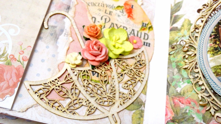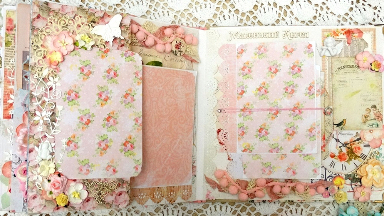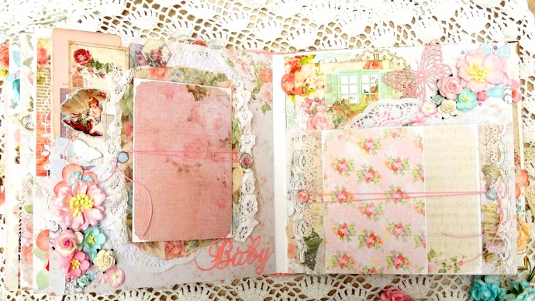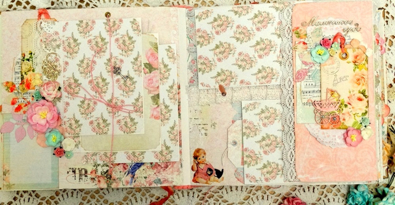 Сам альбом получился и ярким и нежным одновременно, в нем огромное количество цветов (как я и люблю :)), объемных гипсовых украшений, чипборда на детскую тему и пр.