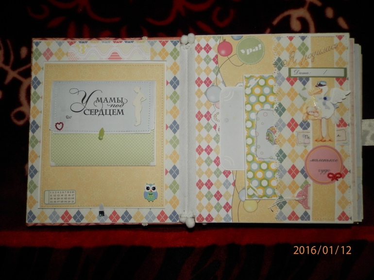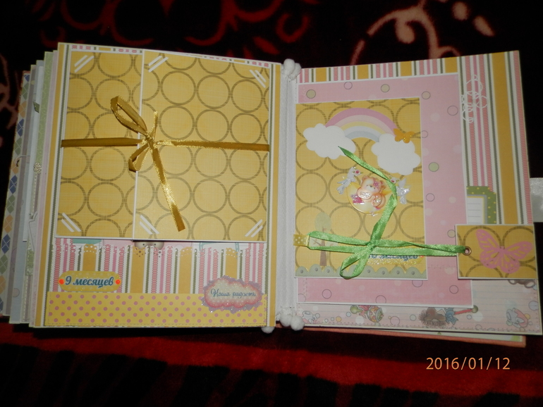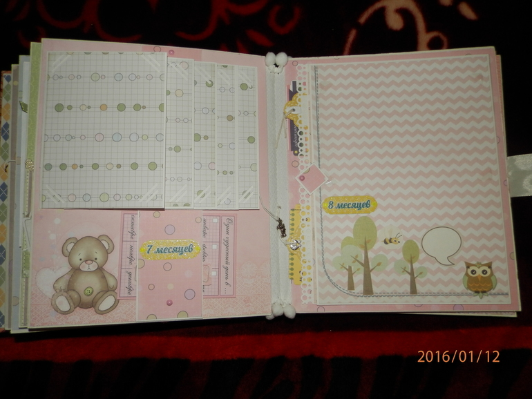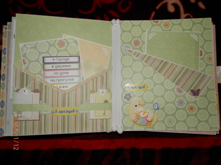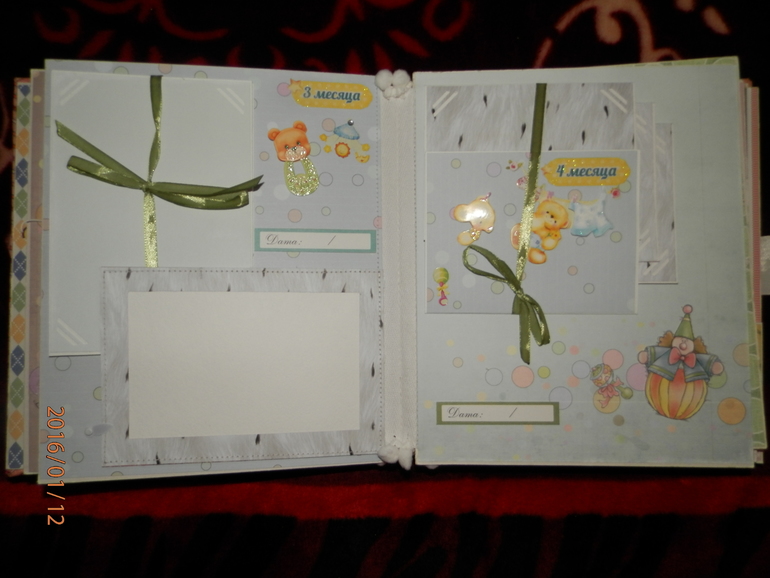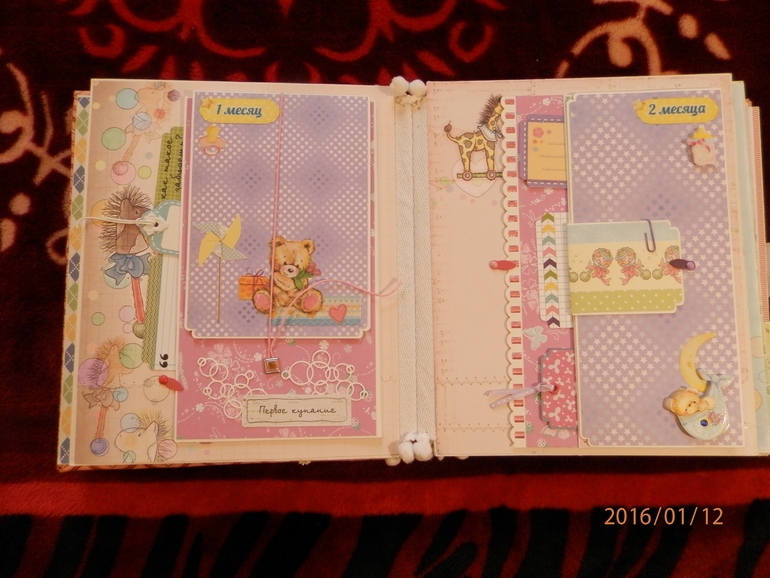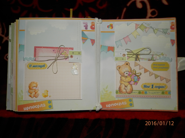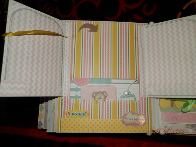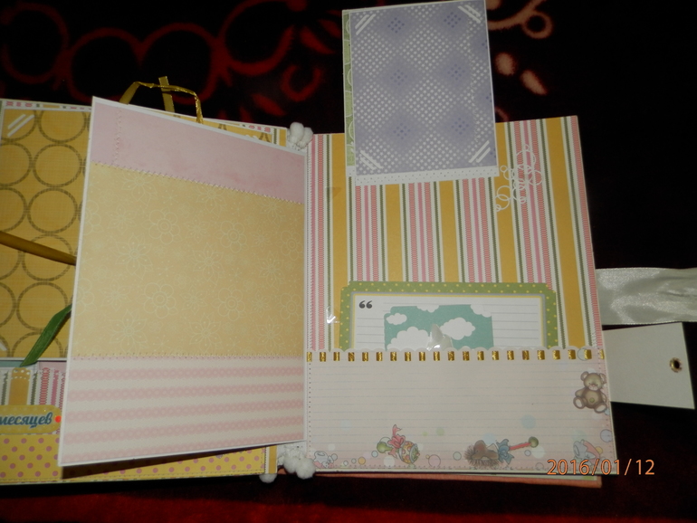 на первой стр. кармашек с 6 фото 9*12 и под большой подложкой есть кармашки для тежиков. Вторая стр. без открывашек, там просто карманы и вставные подложки под фото. Вообще в альбоме очень много тег, чтобы мама не заводила отдельного блокнота, а могла писать какие-то памятные события прямо в альбом. Кроме моих тег она может туда вставить и свои какие=то записки)))