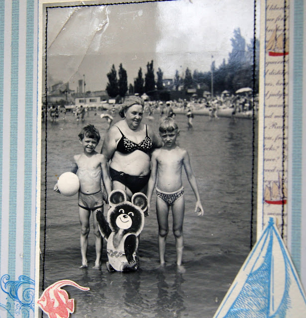 основа бумага от ScrapBerry's. сначала я расположила фото, а потом при помощи штампов "волна" сделала оттиски, кое где прострочила строчкиа поверх штампа добавила глосси, как будто вода затекла на бумагу. люблю старые фотографии, в них черно белый шарм. на фото с лева на право: Андрей мой младший брат, бабушка Надя и Вовка мой старший брат