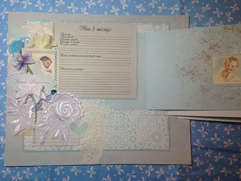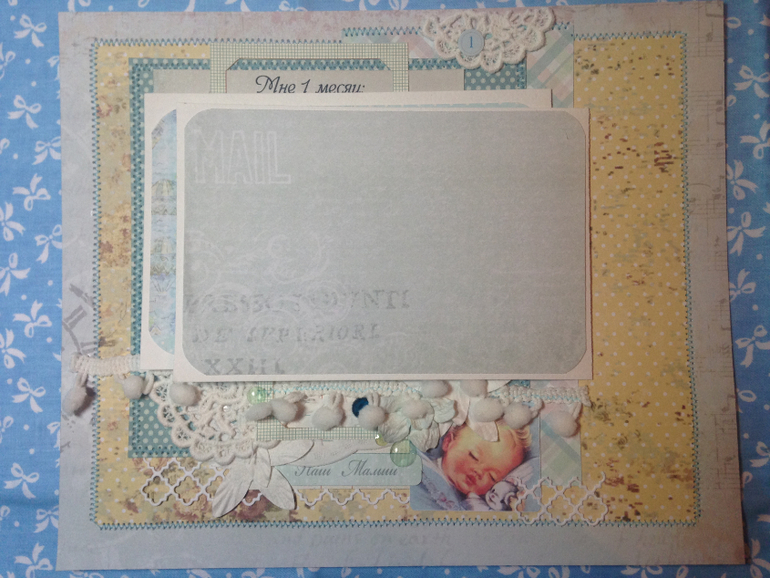 На этот разворот задание будет таким: не менее 4-х видов используемой бумаги (а то смотрю многие "жадничают"), шебби лента, гипсовое или лепное украшение, тканевый цветок - на выбор три пункта из перечисленного. Дерзайте до следующей среды ))