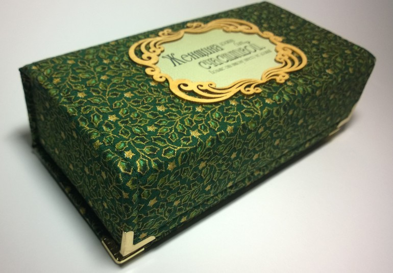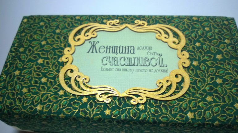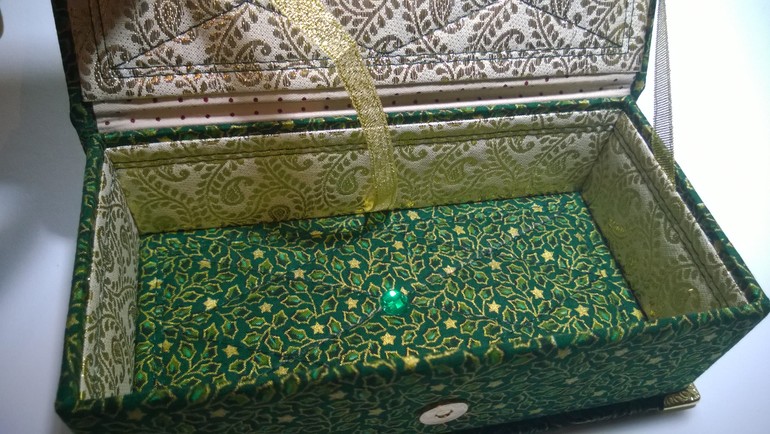 Все как обычно: формат внутреннего короба 18:9 см, проложена шкатулочка поролоном, красивая тканюшка глубокого зеленого цвета+золотая парча. Все прошито, двойная строчка, ромбы. Закрывается на магнит.