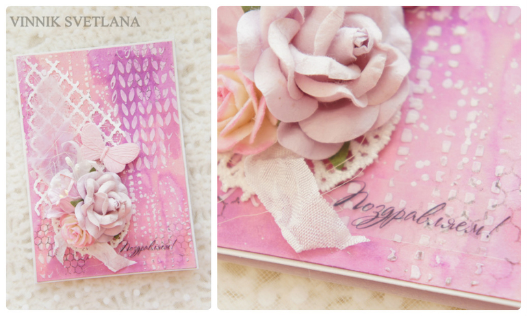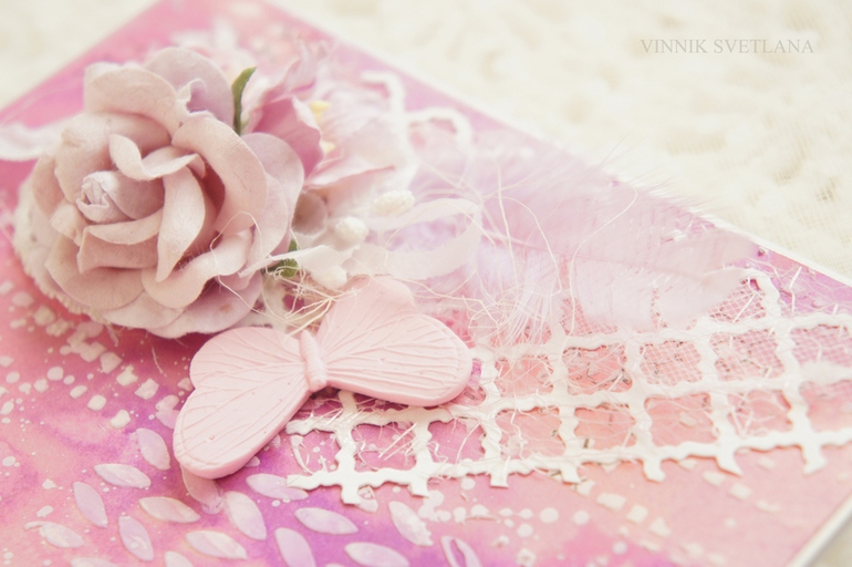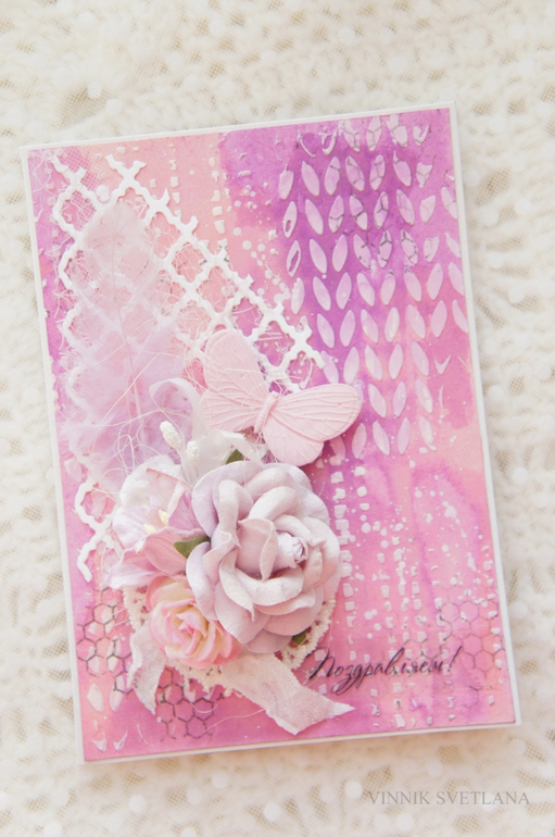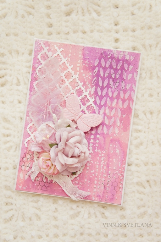 Открытки, приглашения, визиткиВсем добрый день! Первая "бумажная" работа в этом году. Сегодня мама попросила сделать открытку. Получилось очень кстати: как раз хотела попробовать новую маску - вязаное полотно. В работе использовала спреи, текстурную пасту от "Фабрики Декору". Вырубку, цветы, пёрышко, сетку, кусочек фатина, цветы, шебби ленту, элемент кружева, штампинг, запекла бабочку (