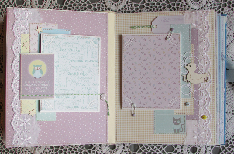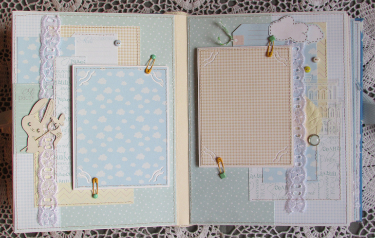 Размер 15 на 20 см, 6 разворотов, вмещает 55 фотографий размером 7,5 на 10 см. Альбом получился таким нежным и малышковым) Последний разворот почему-то стал первым) а дальше по порядку)
