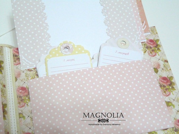 2 разворот для фото первого года жизни по месяцам (12 фото 10*15 см), предусмотрены карман для бирки и карточки из роддома, теги для записей по каждому месяцу