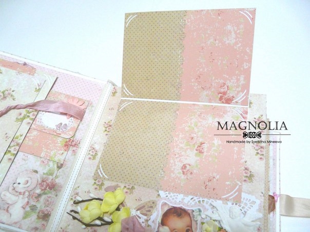 1 разворот для фото мамы и папы (4 шт 10*15 см), фото я родилась (3 шт 10*15 см и 2 шт 10*7,5 см), есть теги для записей В ожидании и с данными при рождении и крещении, карман для фото узи