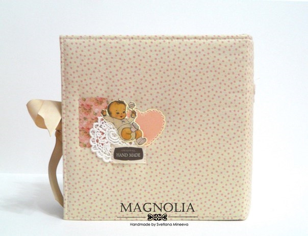 Итак, альбом для Марии, формат 21*21 см, тканевый прошитый переплет по МК Светочки Ковтун. Обложка мягкая тканевая (натру.хлопок), состоит из 7 разворотов (14 страниц), вмещает 69 фото 10*15 см и 22 фото 10*7,5 см (оформлены в виде тегов)