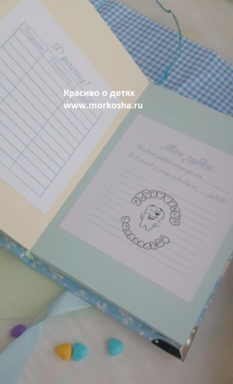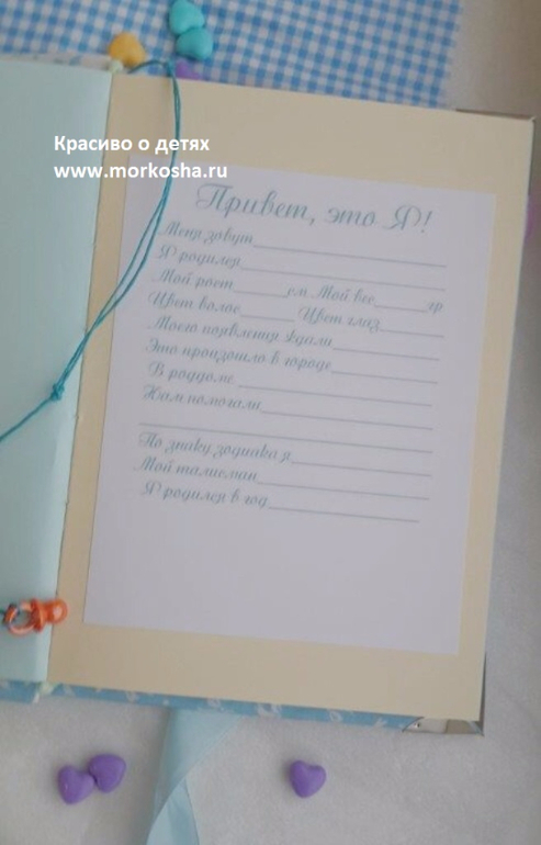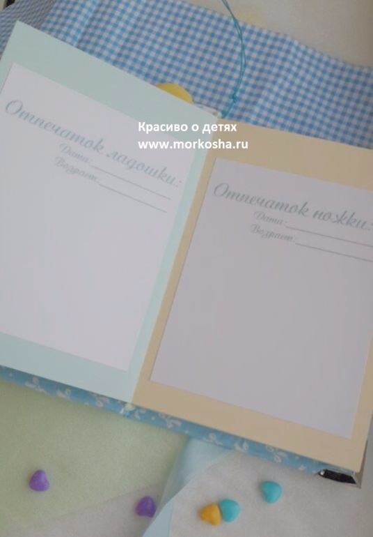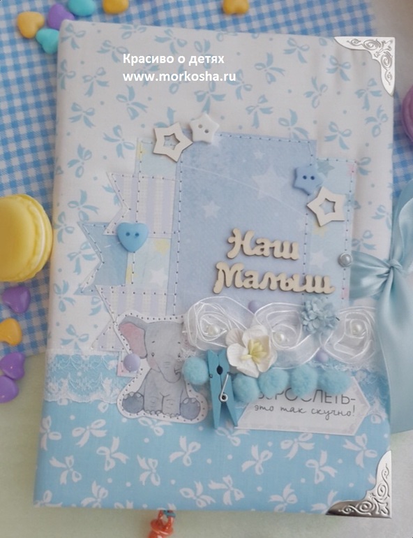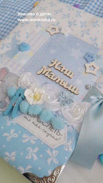 Альбомы ДетскиеНежный фотобук формата А5, внутри 120 страниц нежно-голубой и песочной плотной бумаги, на которых можно разместить не только фотографии, но и записи о малыше, в начале фотобука 6 табличек-наблюдений за малышом от 0 мес до 1 года.