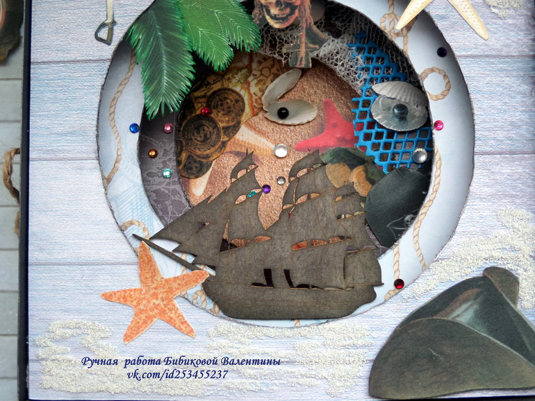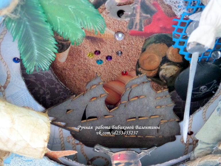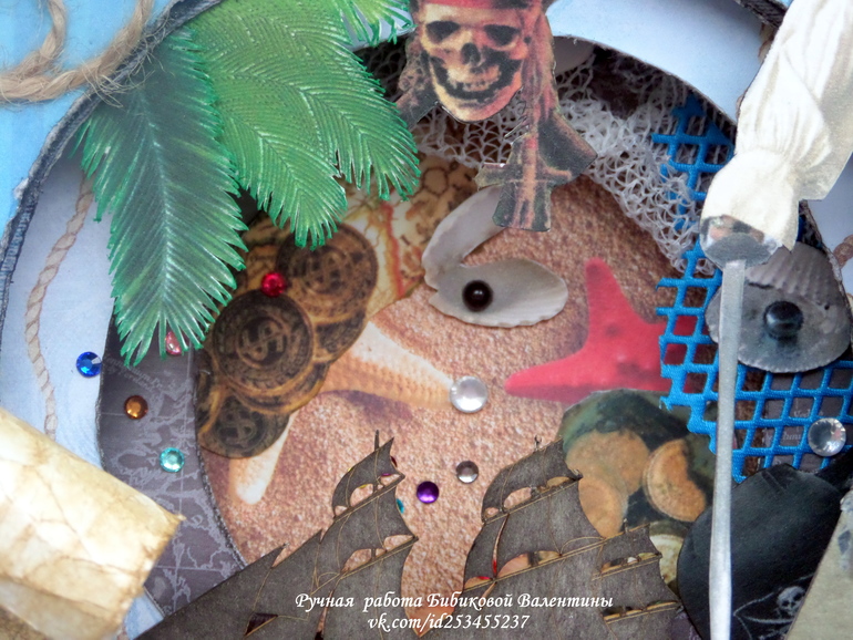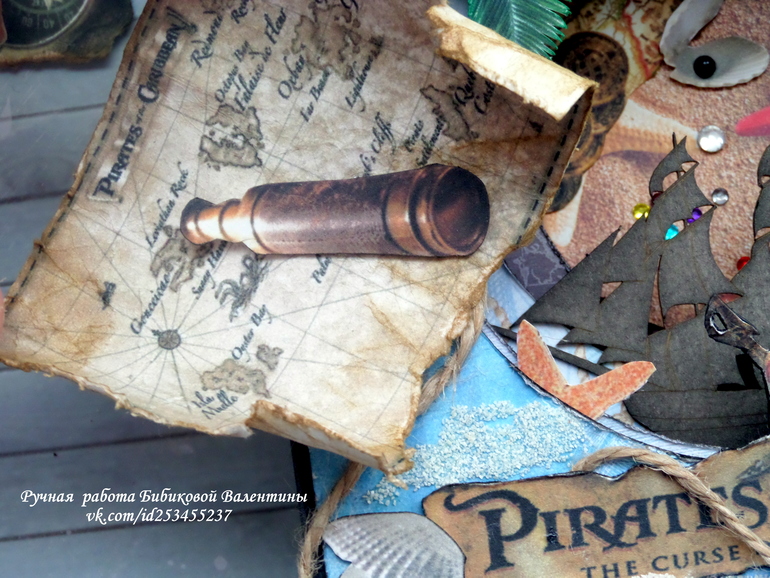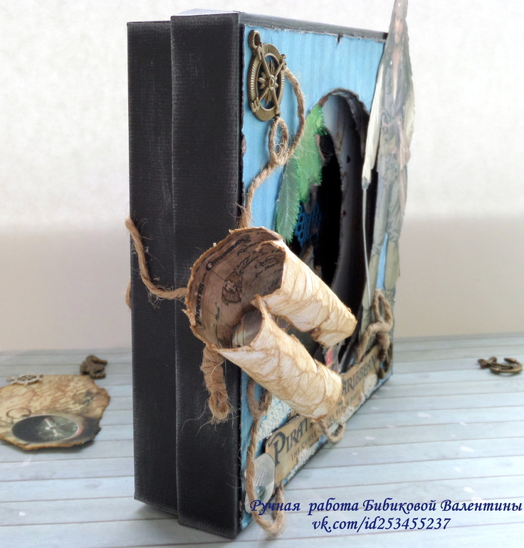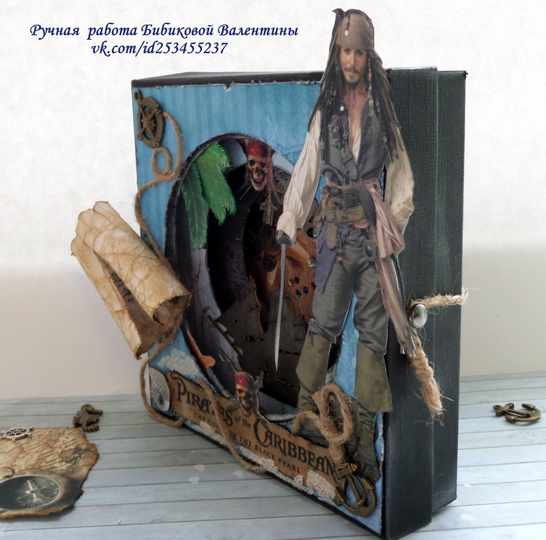 Открытки, приглашения, визиткиВсем доброго утра, дня, вечера, ночи!) Хочу показать вам открыточку, сделанную по заказу замечательной девушки для себя и сына) Оба они любят Джека Воробья, Черную жемчужину и всю эту пиратскую историю)) Открытка в коробочке. Размер 15х15 см. Прошу к просмотру)
