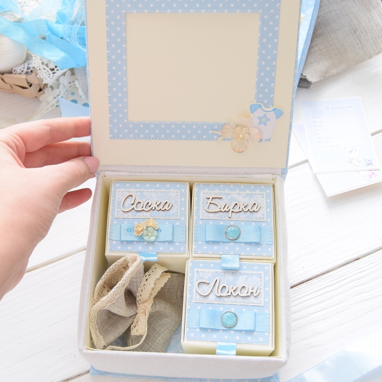 Внутри коробочки под локон, бирочку и соску, а также льняной мешочек для памятных мелочей с маленькой баночкой для зубика