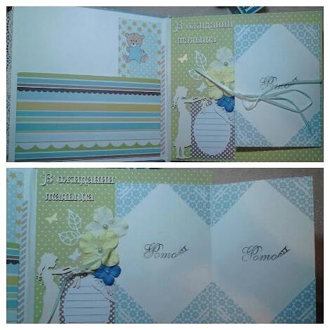 на форзаце объемный карман и первая страничка "В ожидании" для трез фотографий.