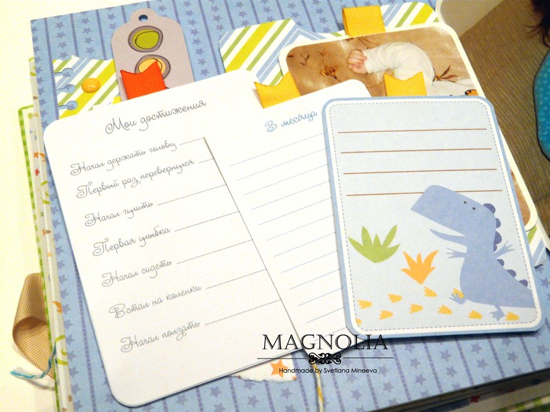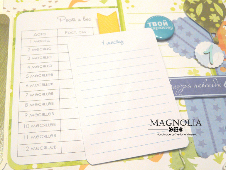 В альбоме предусмотрены поля для записей, теги для записей от 1 по 12 месяц, карманы для фото узи, бирки и локона, карточки для записи веса, роста, зубок, достижений