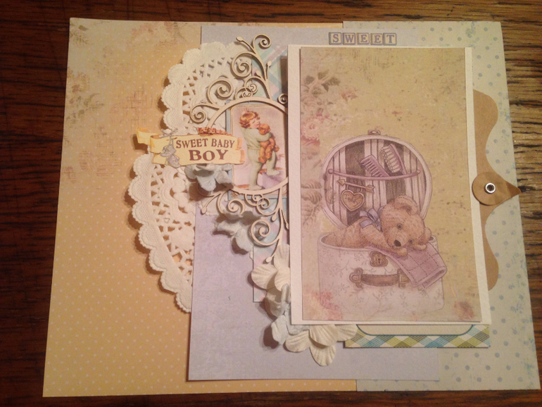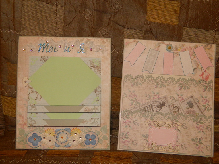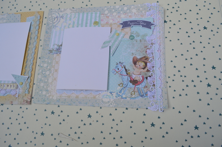 Мне светлых тонов не хватает и синие цветы выбиваются. Я бы на первой страничке добавила слоёв бумаги, а то как-то скудновато (все-таки шебби должно быть богаче), а на второй где флажки - не хватает веревочки или хотя бы машинной строчки