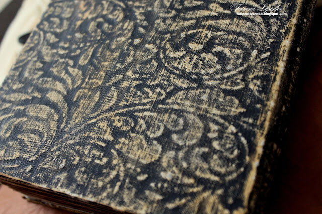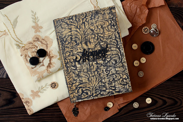 Обложка в нем не простая. Здесь самостоятельно сделанный фон, который не единожды мазался, сушился, тёрся и затирался.