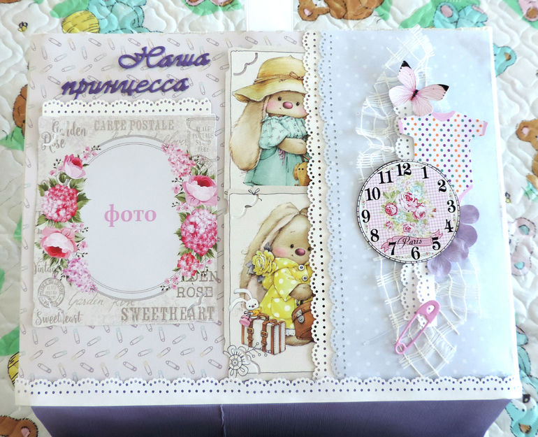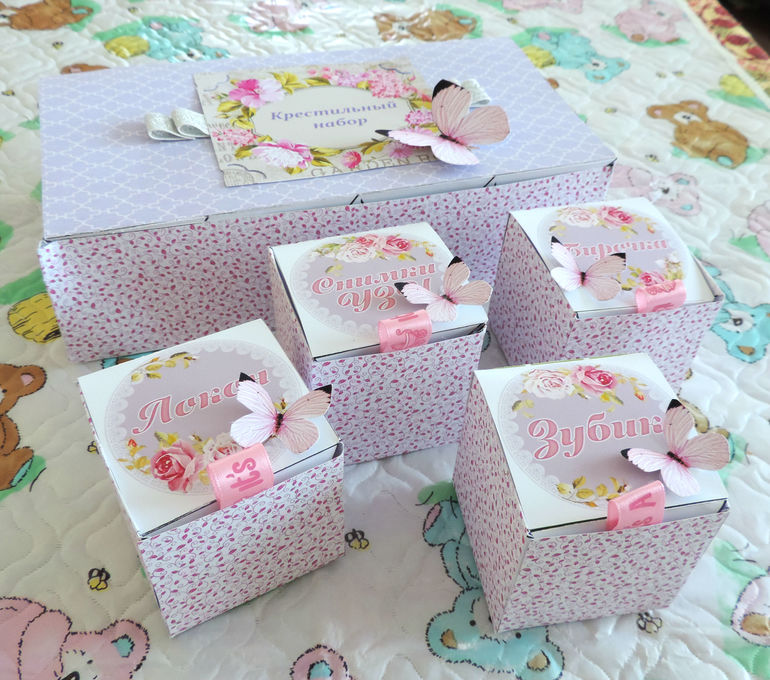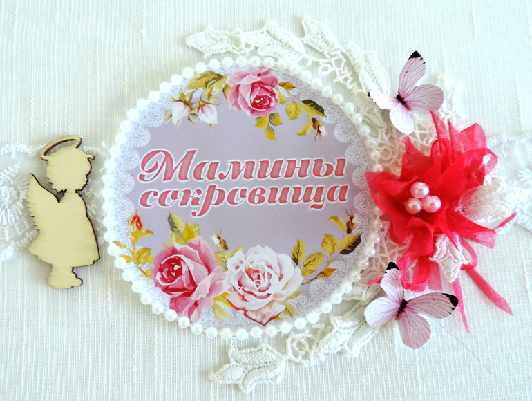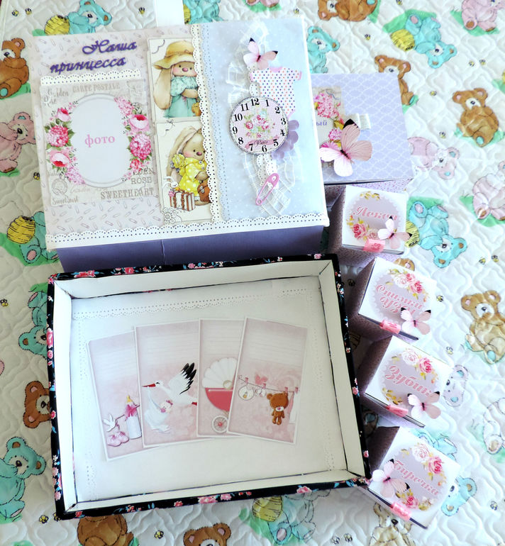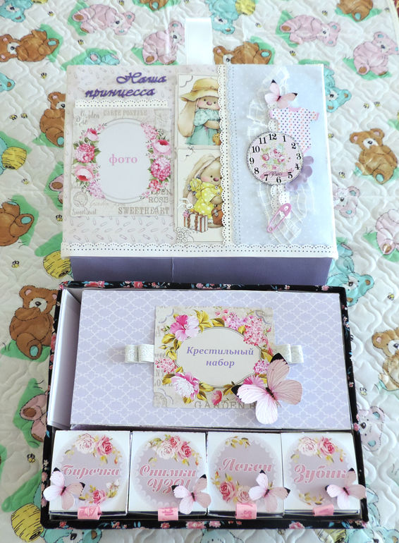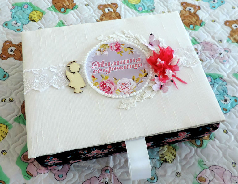 Коробки, шкатулки, комодыШкатулочка-сокровищница для хранения самых дорогих нам мамочкам вещиц. В шкатулке 5 коробов, в один из которых поместим крестильный набор. Возле этого коробка я оставила немного места для помещения карточек для записей, заметок. На часиках логично отметить время рождения ребеночка, так же есть 3 подложки для фото + кармашек, в него можно поместить еще несколько фото. Размер сокровищницы 26*21 см, обтянута тканью.