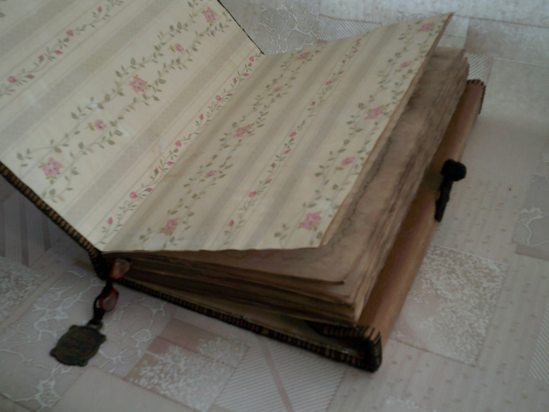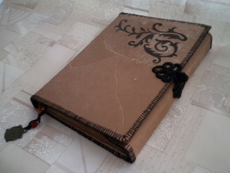 Сотворила недавно вот такой софтбук. Размер А5, 200 страниц, тонированных кофе+корица, переплет. Делала впервые, процесс очень понравился.