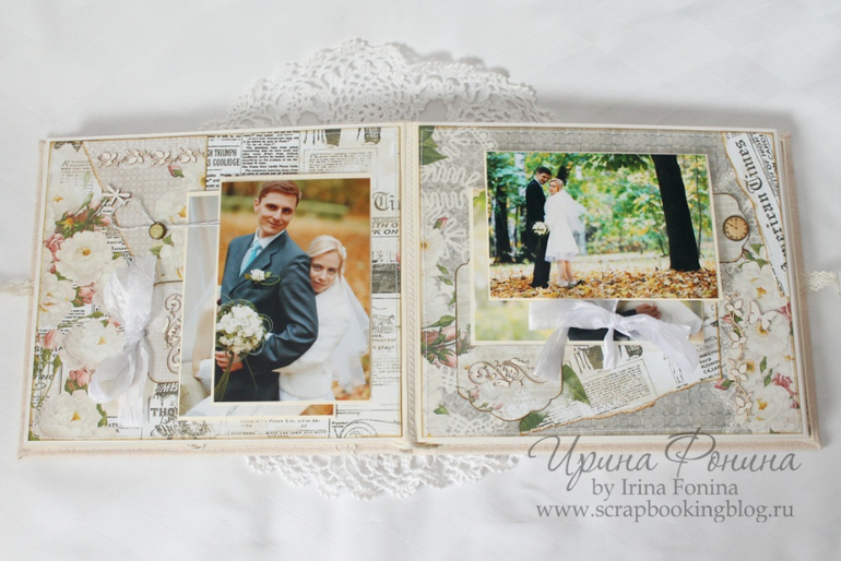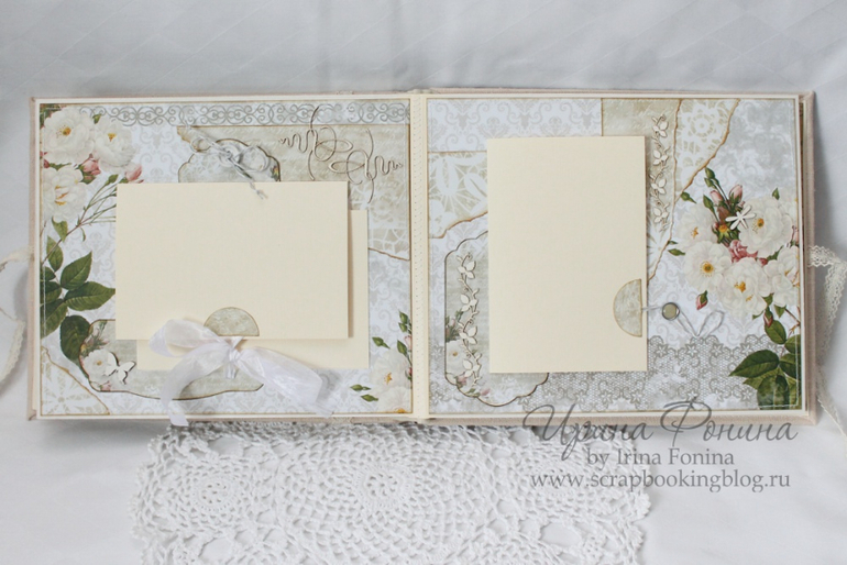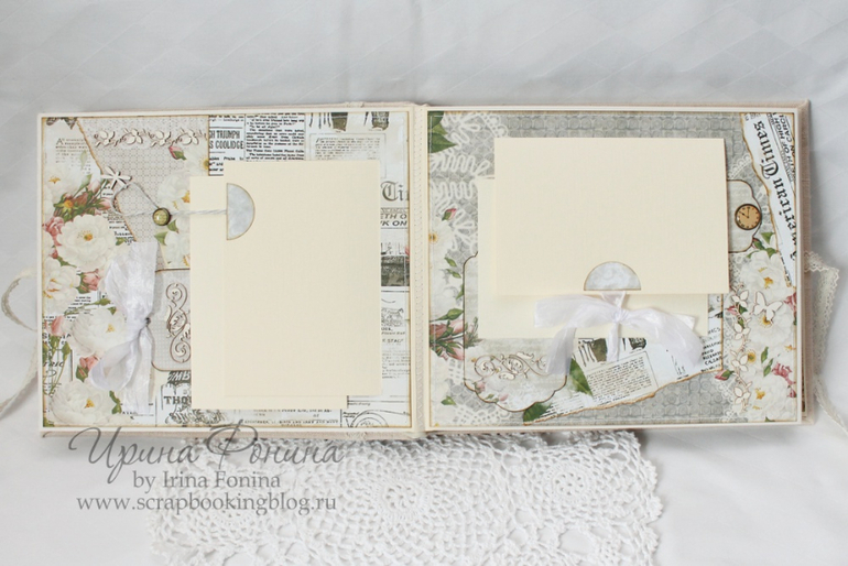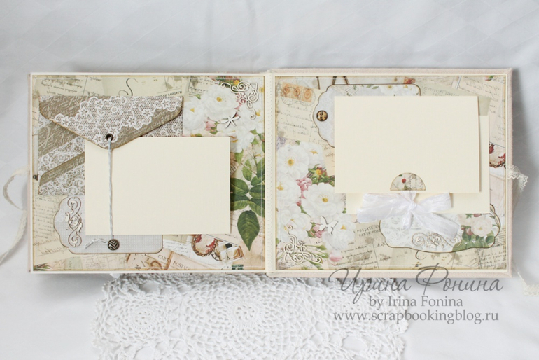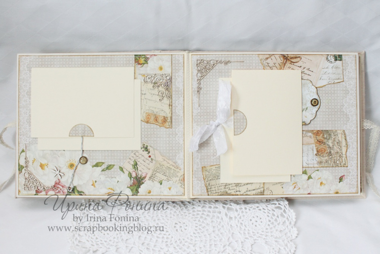 Места для стандартных фотографий 10х15см размещены так, что вы будете видеть сначала только один снимок, а развязав шнурок или ленточку откроете больше. В альбом можно поместить до 44 фотографий.