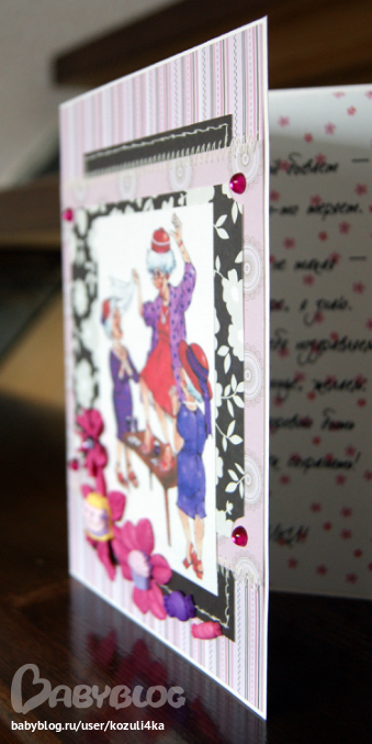 от себя добавлю, что эта открытка мне кажется не для пожилой женщины, а скорее наоборот для молодой и энергичной с намеком на то, что бы она и в пожилм возрасте оставалась такой же озорной как и сейчас), хотя кто его знает... может и есть такие озорные бабушки, тети и мамы)))