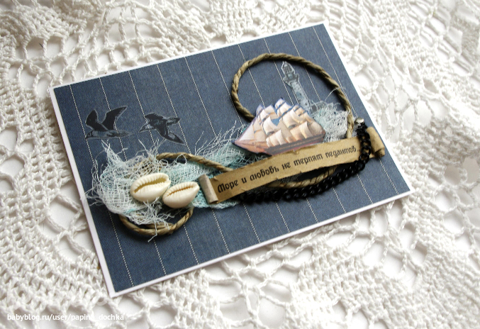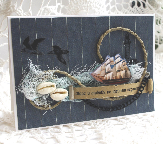 Использована бумага Graphik45, натуральные ракушки, окрашенный бинт, распечатка корабля, металическая цепочка на брадсах, самодельные оверлеи (птицы, маяк). Цитата Грэя из Алых парусов.