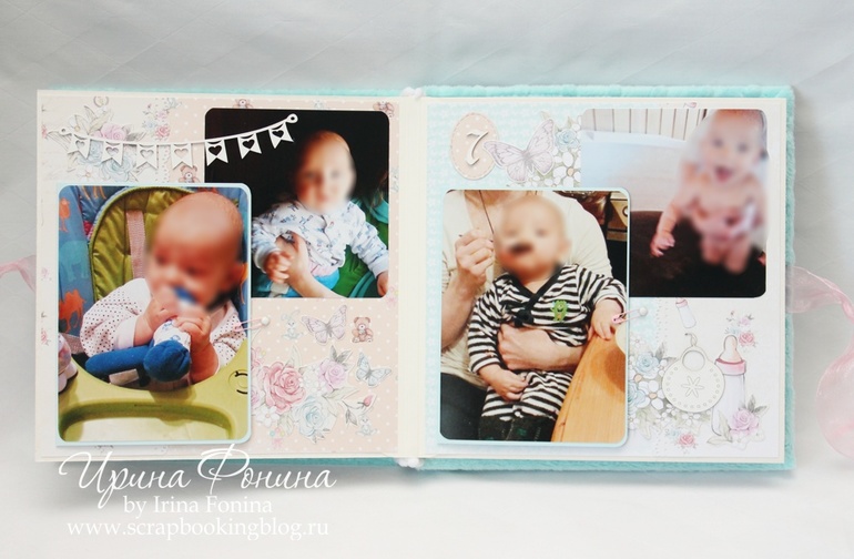Альбомчик совсем не большой, 20х20см. Но в нем уместилось около 40 фотографий, от рождения до 7-го месяца малыша. Для этого понадобилось 10 страниц (с использованием книжек-раскладушек). Фотографии в альбоме размером 10х10см и 10х15см. Снимки распечатаны, как всегда, на бумаге Kodak премиум класса.