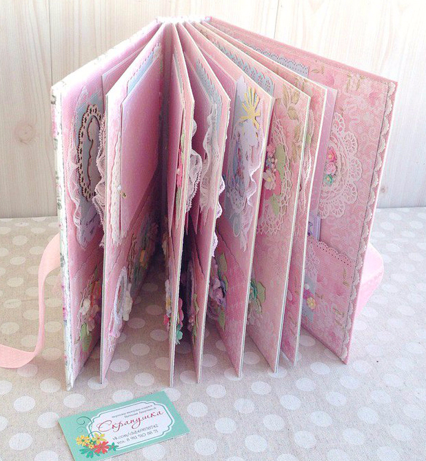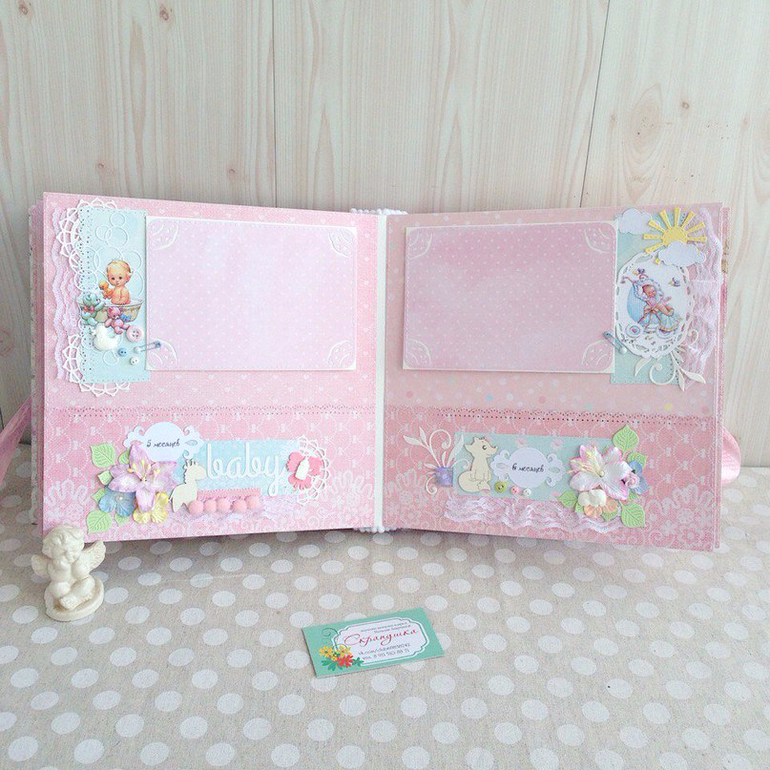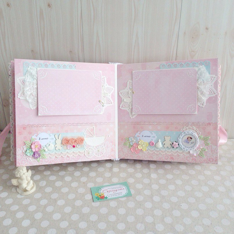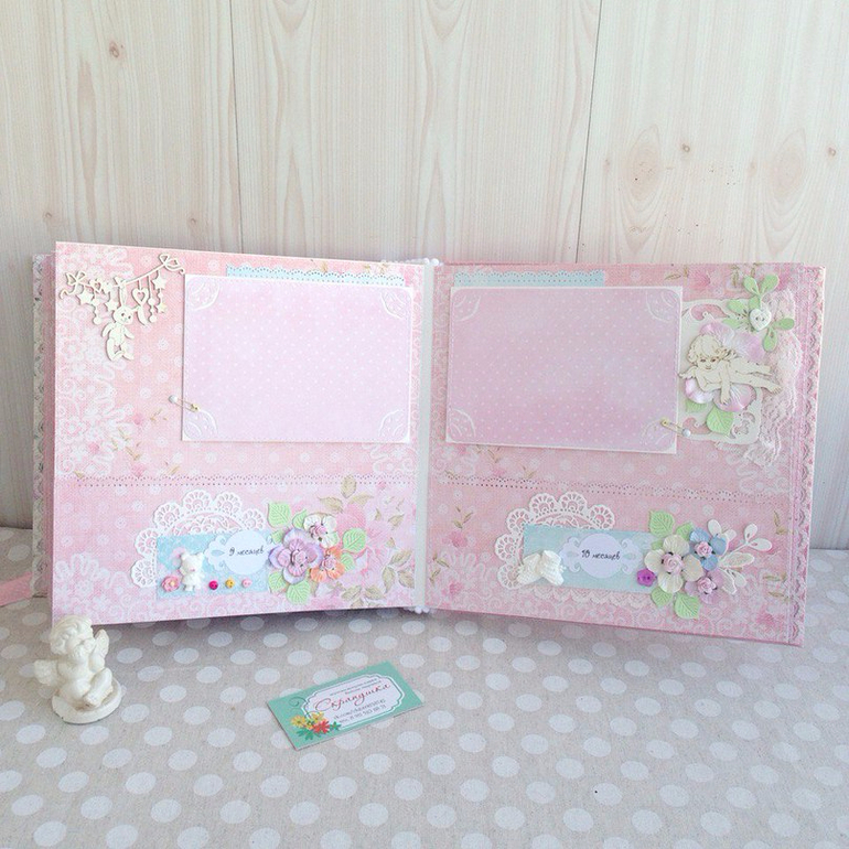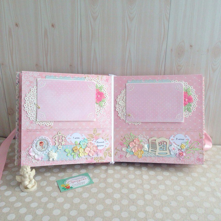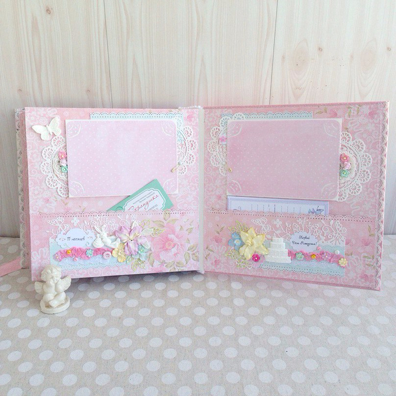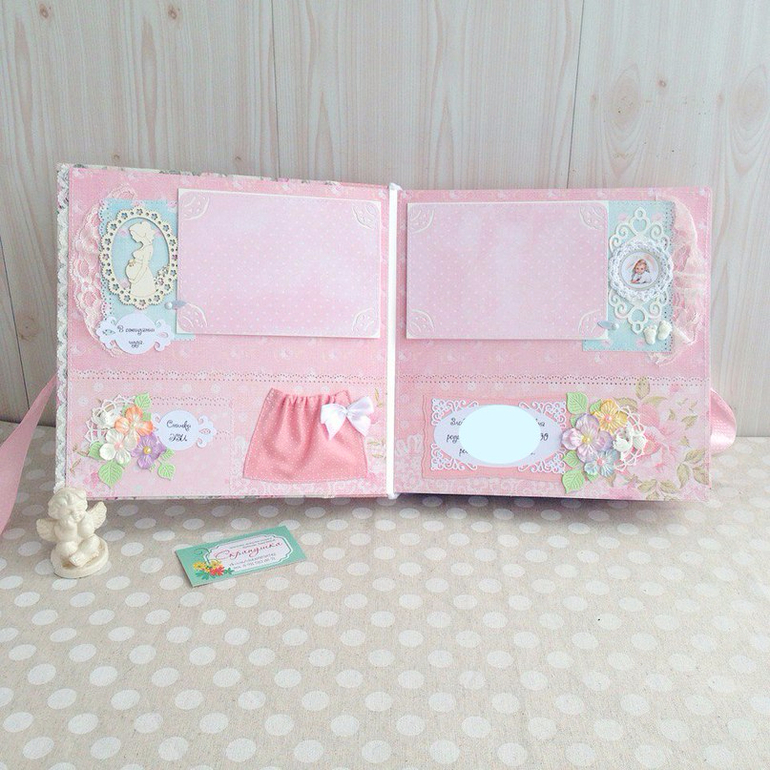 Альбомы ДетскиеВот такой кружевной зефирно-розовый альбом полностью ручной работы у меня получился, в мягкой хлопковой обложке, формат 25х25, переплет на 7 разворотов (14 страничек), количество фото - очень много) благодаря большому надежно пришитому кармашку на каждой страничке. Так же предусмотрено место для бирочки и снимков УЗИ. Принимаю заказы.