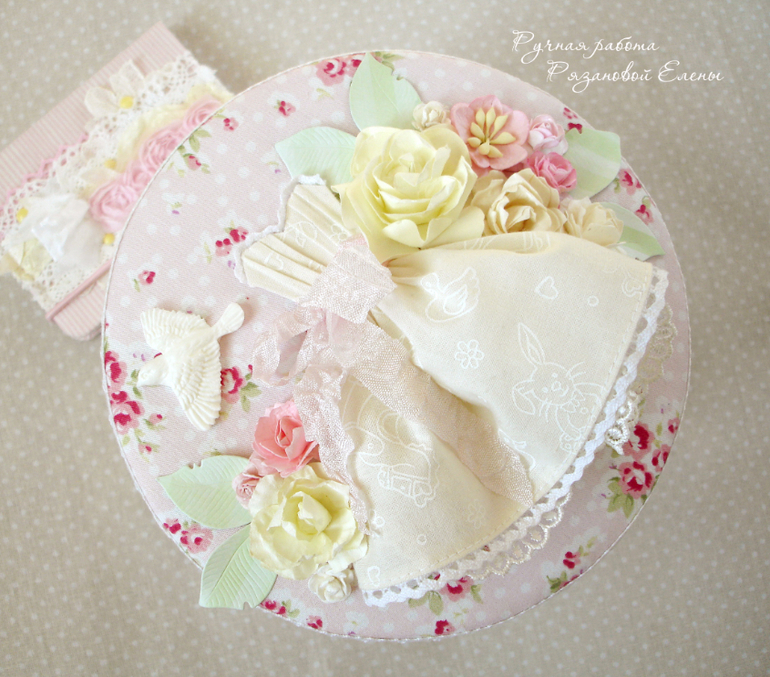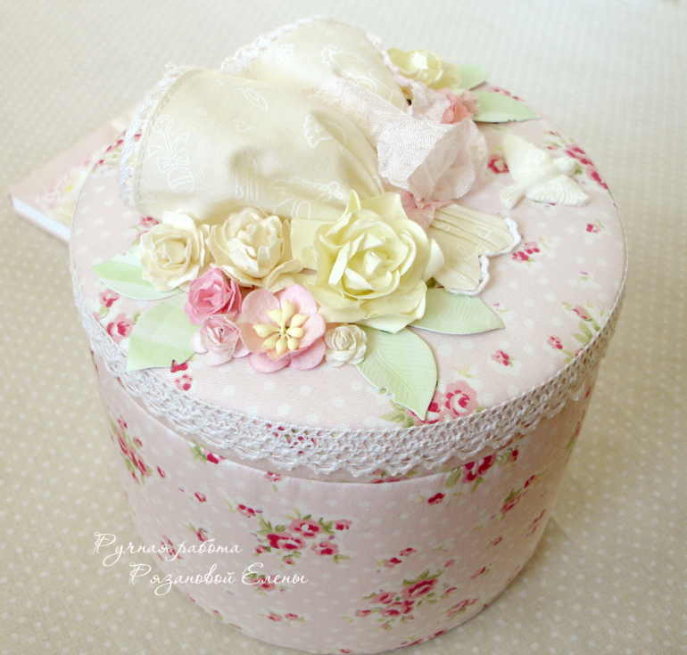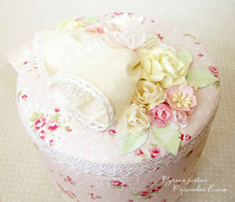 Коробки, шкатулки, комодыА у меня сегодня первая текстильная круглая коробочка! Надо признаться, не очень я довольна результатом, ткань натянуть равномерно не получилось, а верхняя крышка не плотно приклеилась по краям, пришлось приклеить кружево, но опыт я получила. Над украшением думала не долго, так как время поджимало, да и фотографировала быстро. Коробочка в подарок племяннице, в коробке могут храниться бантики и резиночки для волос (несколько бантиков я сделала сама из обрезков лент и кружева).