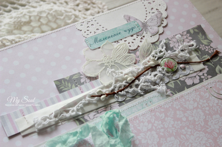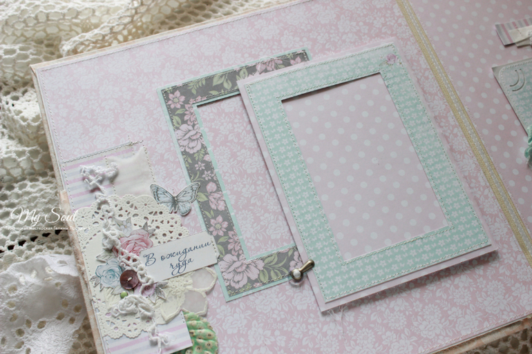 Формат альбома 30*30 см, в нем 6 разворотов, 12 оформленных страниц. Есть различные кармашки и конвертики для памятных вещиц, а также большой карман для дополнительных фото и первых рисунков малышки.