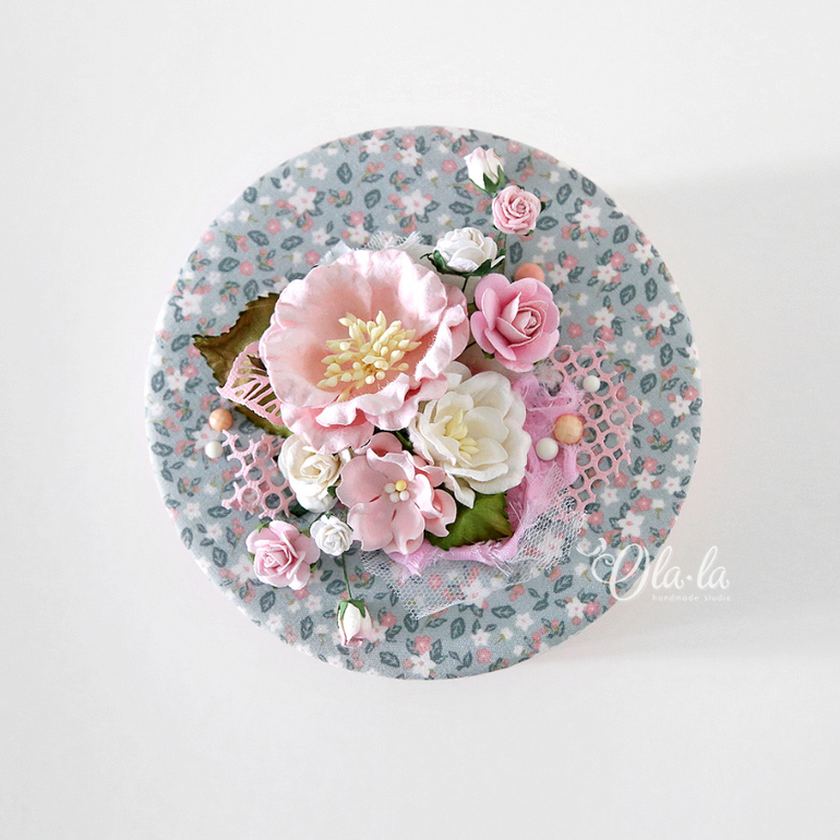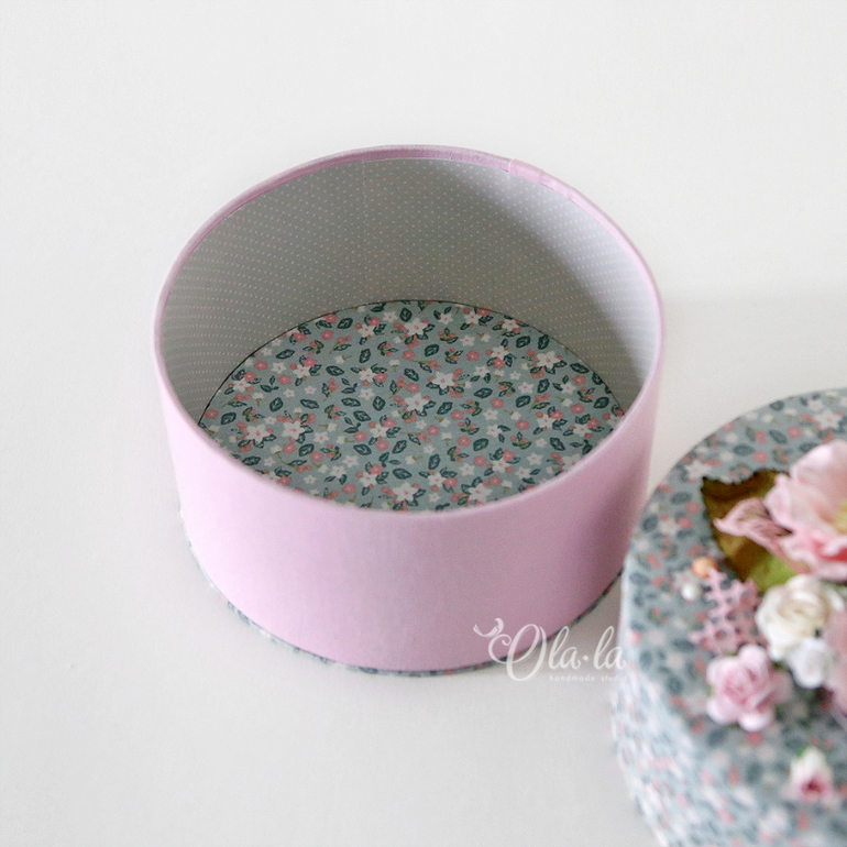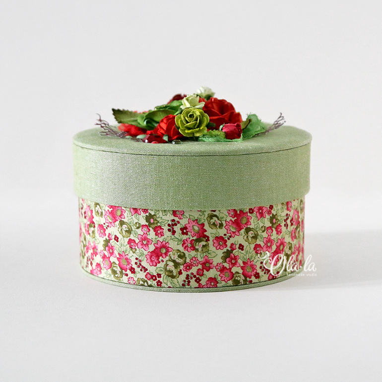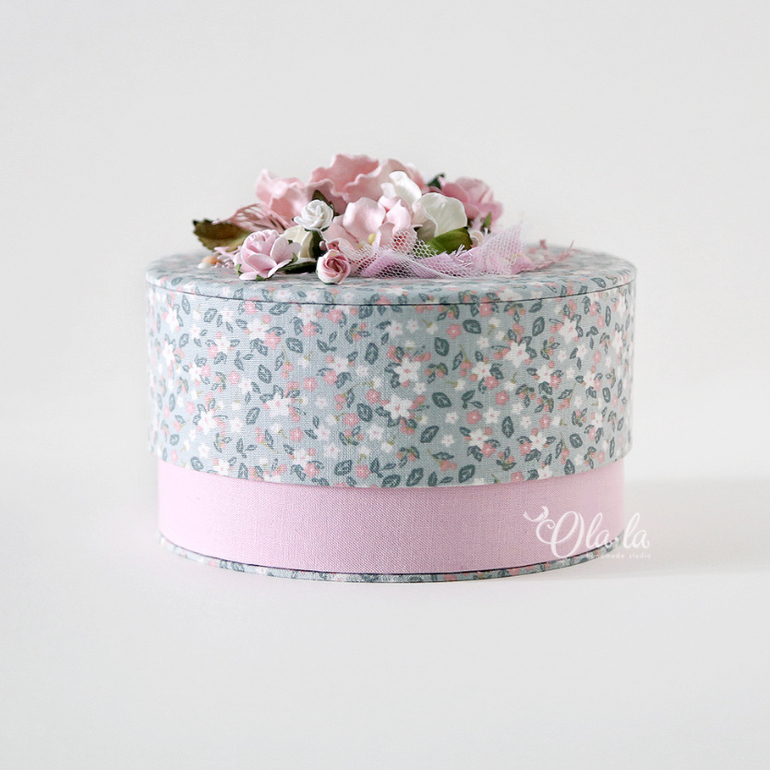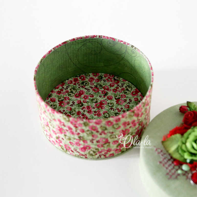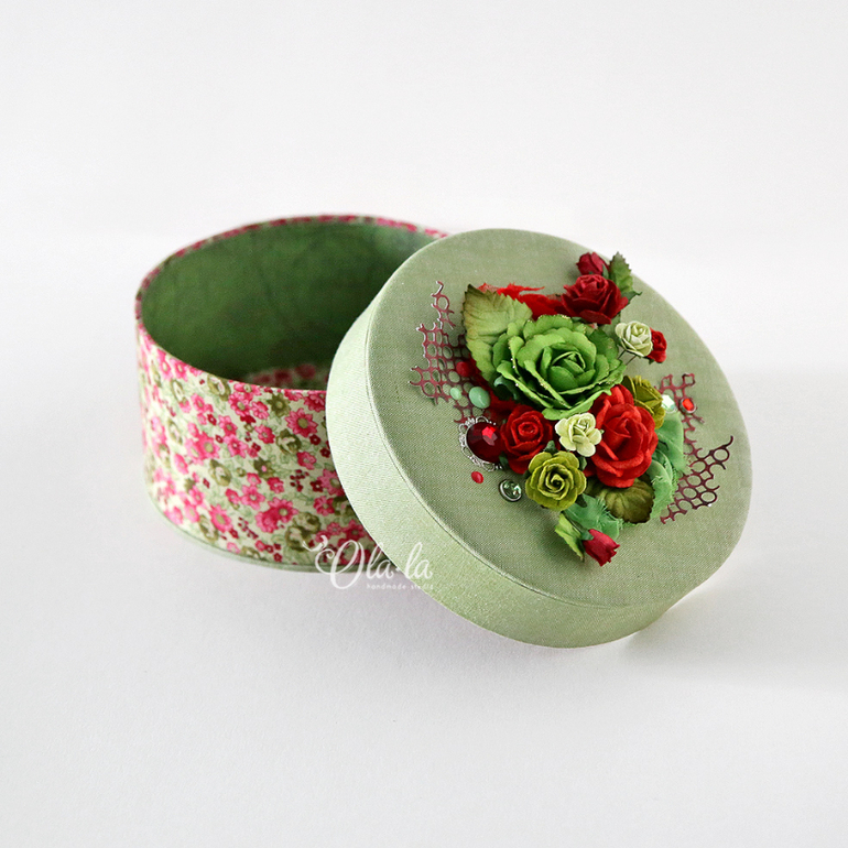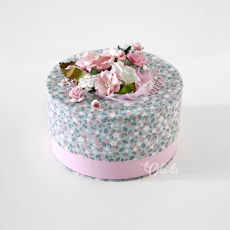 Диаметр шкатулочки 14см, высота 8 см. Внутри тканевое дно (стенки - бумага), крышка полностью тканевая. Основание такое же как и крышка - цветочное))