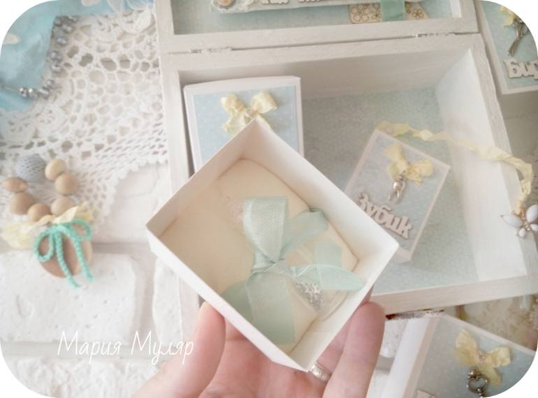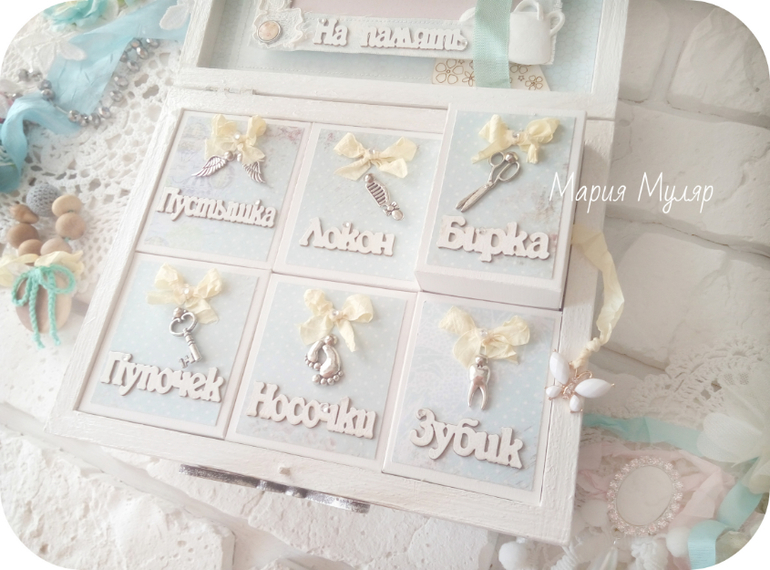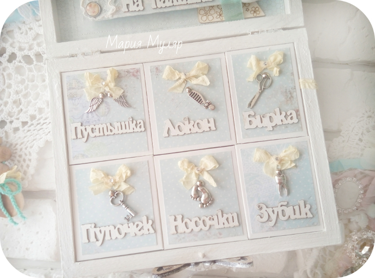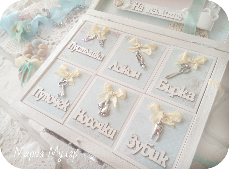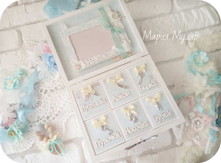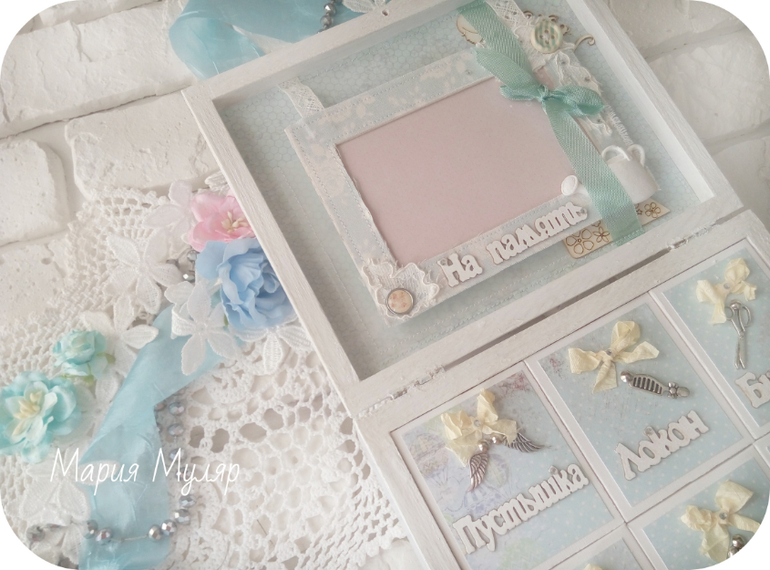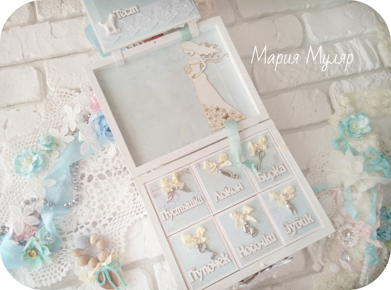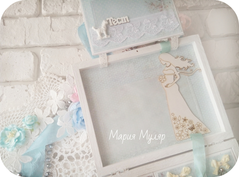Деревянная,с коробочками внутри,местом под первое фото,фото узи и для теста на беременность.