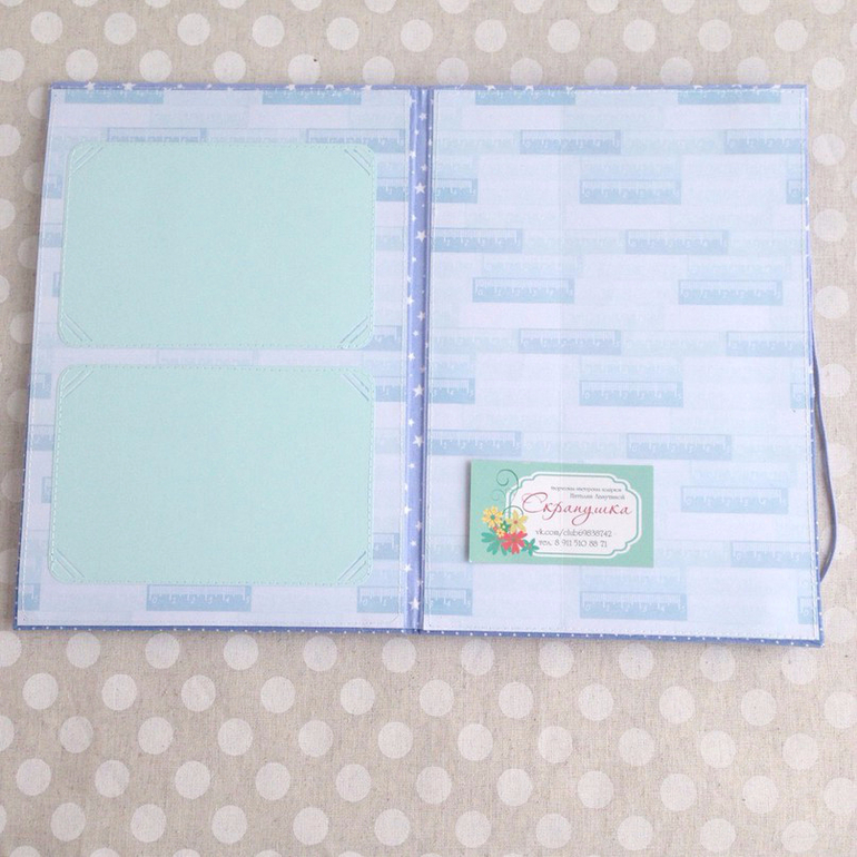 Мягкая хлопковая обложка, закрывается на резиночку. Внутри кармашек для свидетельства и место для двух фото 10х15.